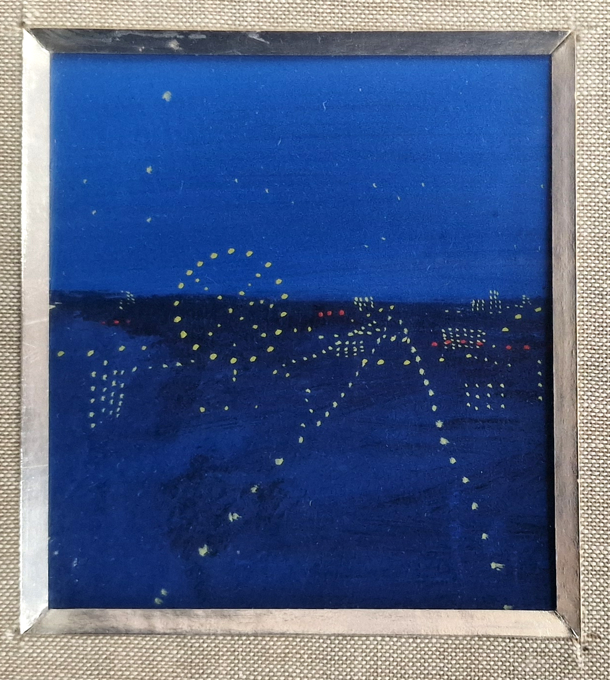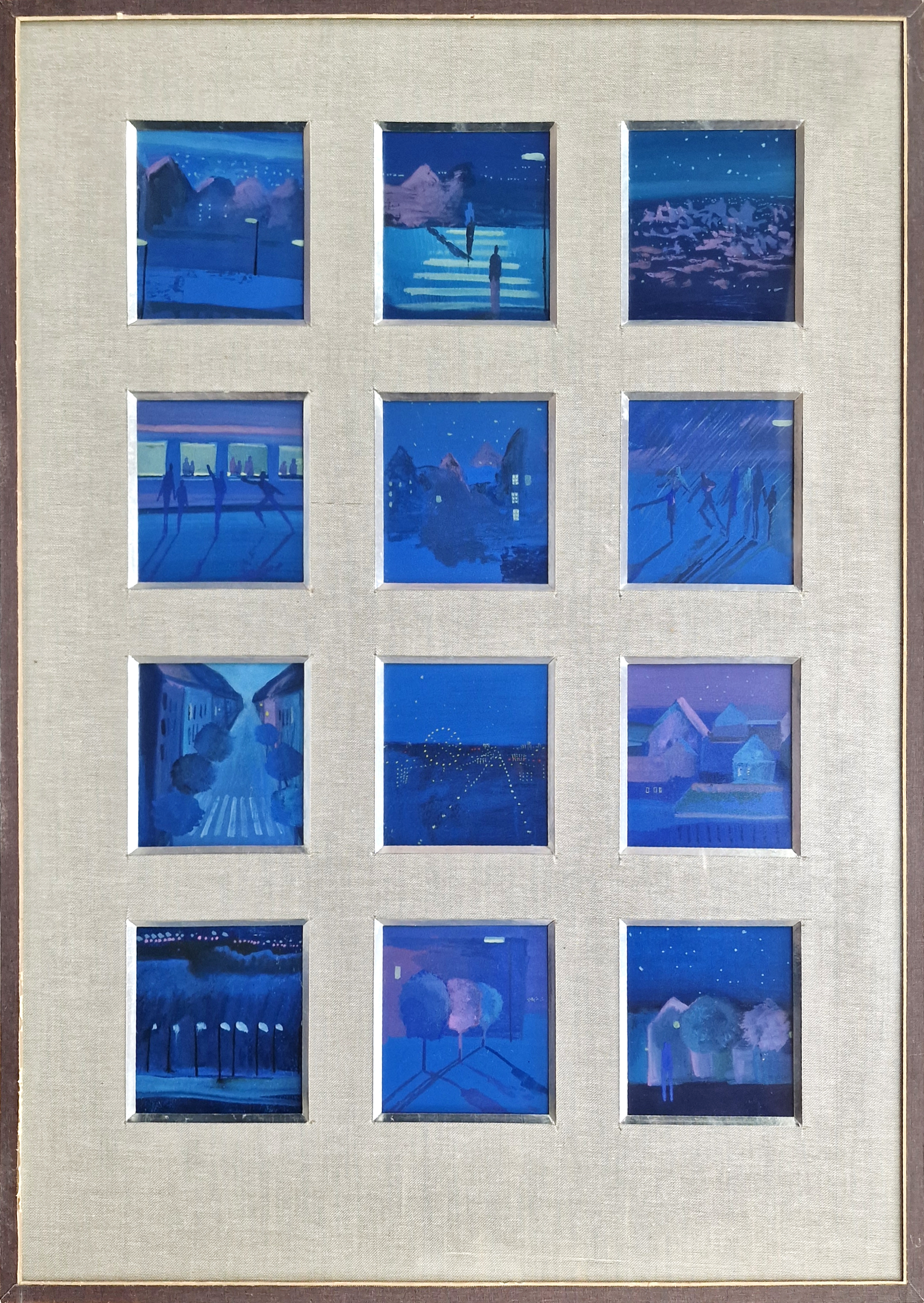 POPIS: Tempera, celkový rozměr 70 x 50 cm, rozměry jednotlivých výřezů 10 x 9 cm, zaskleno