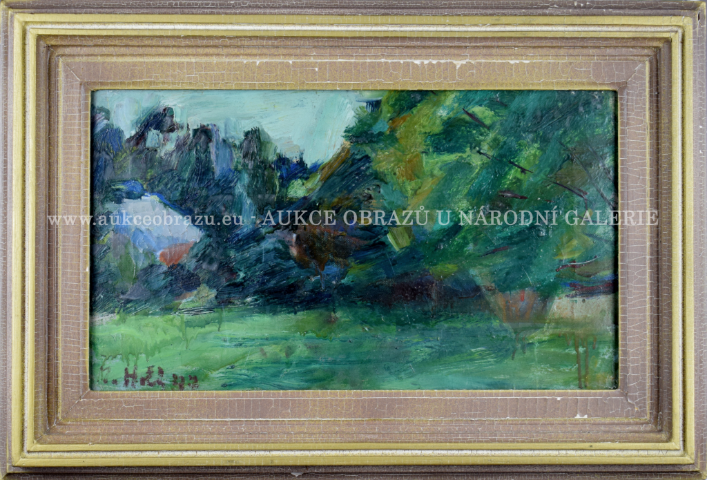 POPIS: Olej na plátně, rozměr 28 x 47 cm, zaskleno, vzadu značeno číslo soupisu 1335, datováno 1947