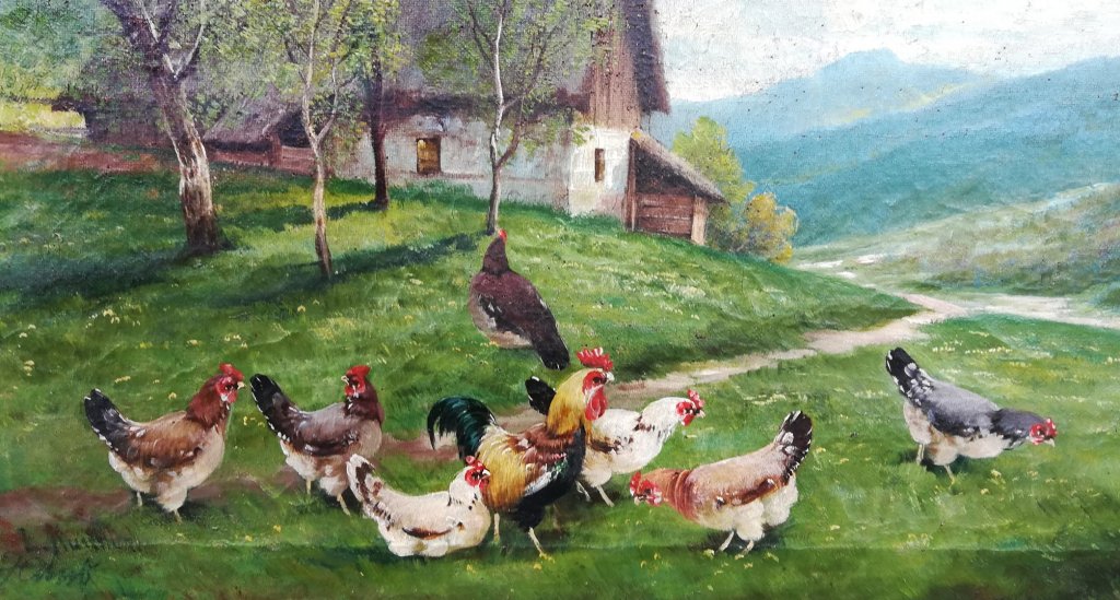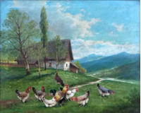 Chalupa se slepicemi a kohoutem Nečitelně signováno