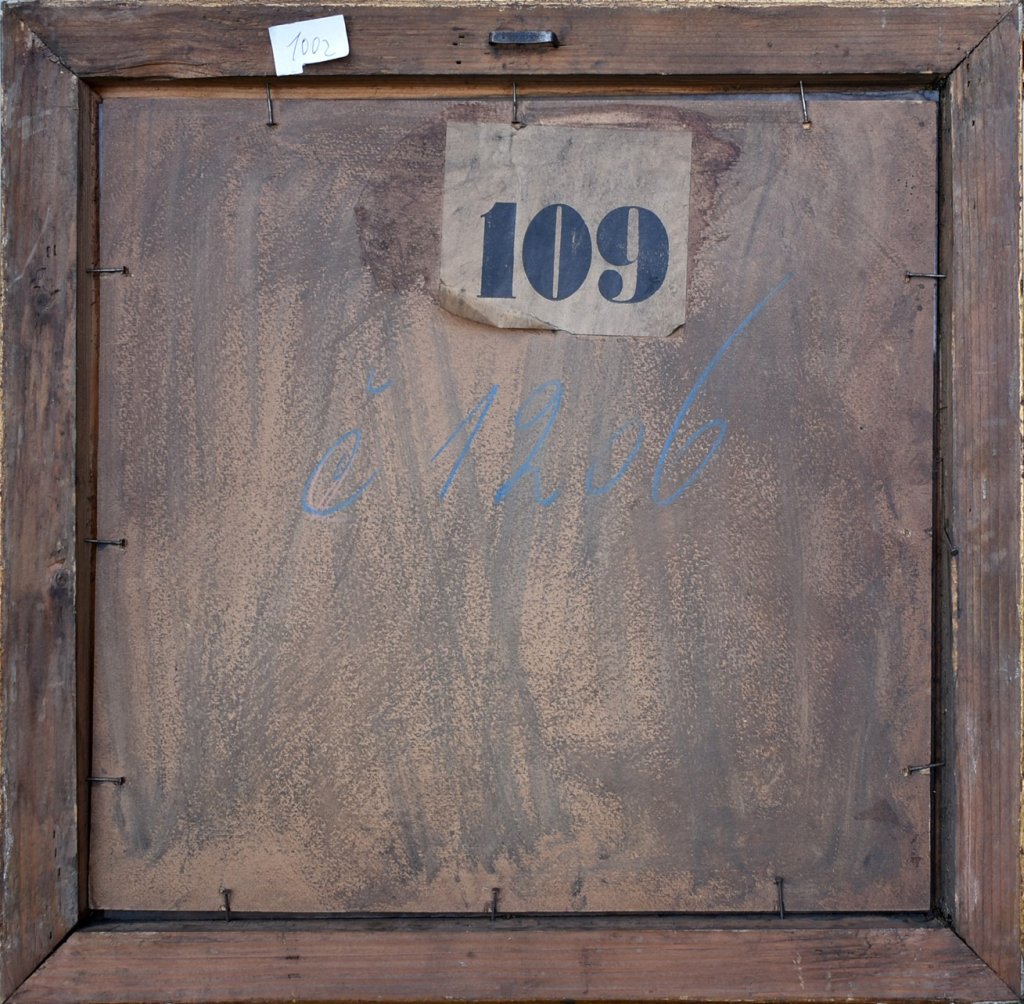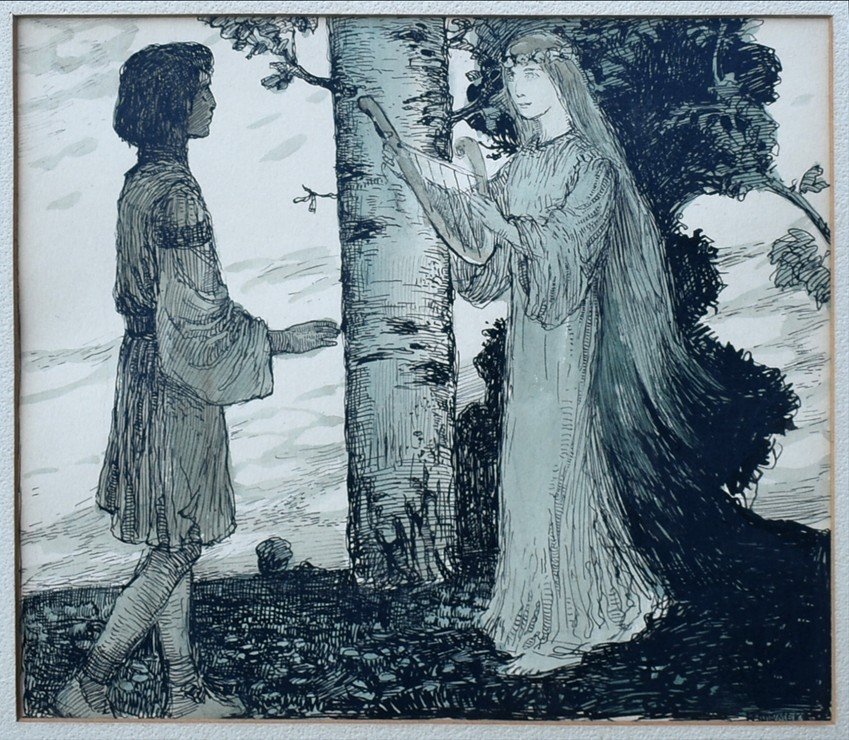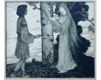 POPIS: Kolorovaná perokresba, rozměry ve výřezu pasparty: 16 x 18,5 cm, zaskleno, poškozený rám. Vzadu číslo z výstavy nakladatelství Edvard Beaufort