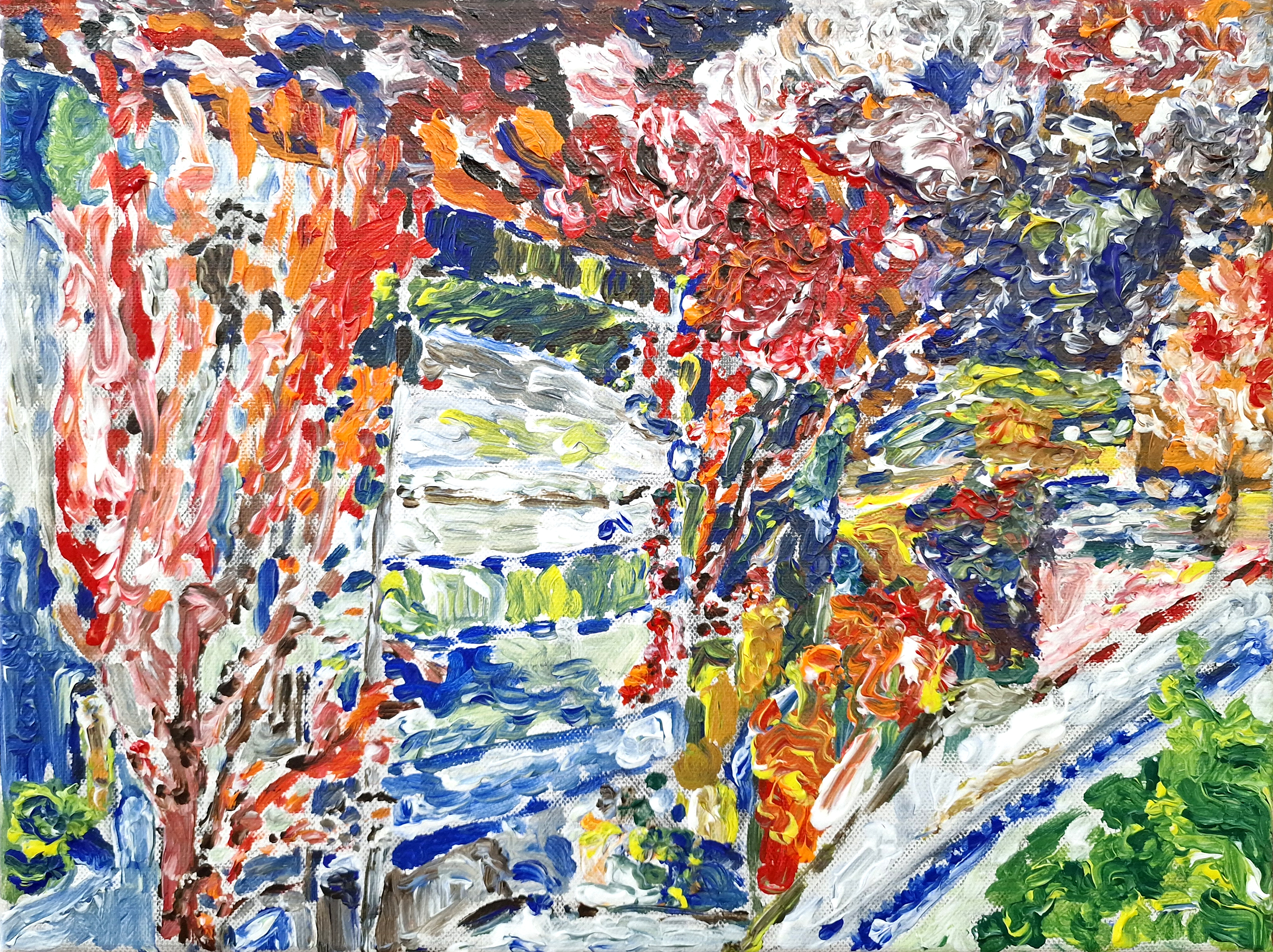 Své motivy maluje přímo ve městě, vidí ulice a každodenní lidi.