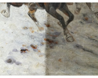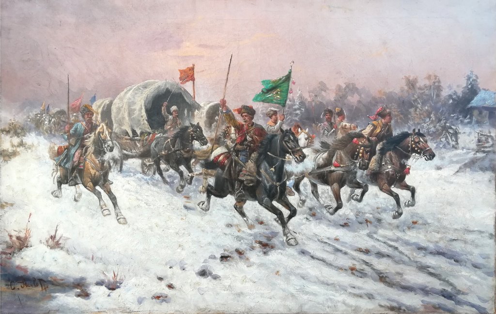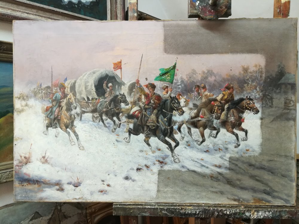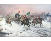 POPIS: Olej na plátně, rozměry 69 x 105 cm. Poměrně rozměrný obraz znázorňující výjev útoku Zlatého sibiřského konvoje. Obrazy s tímto autorovým oblíbeným motivem se draží v mnoha významných světových aukčních domech. Obraz byl odborně restaurován a vyčištěn.