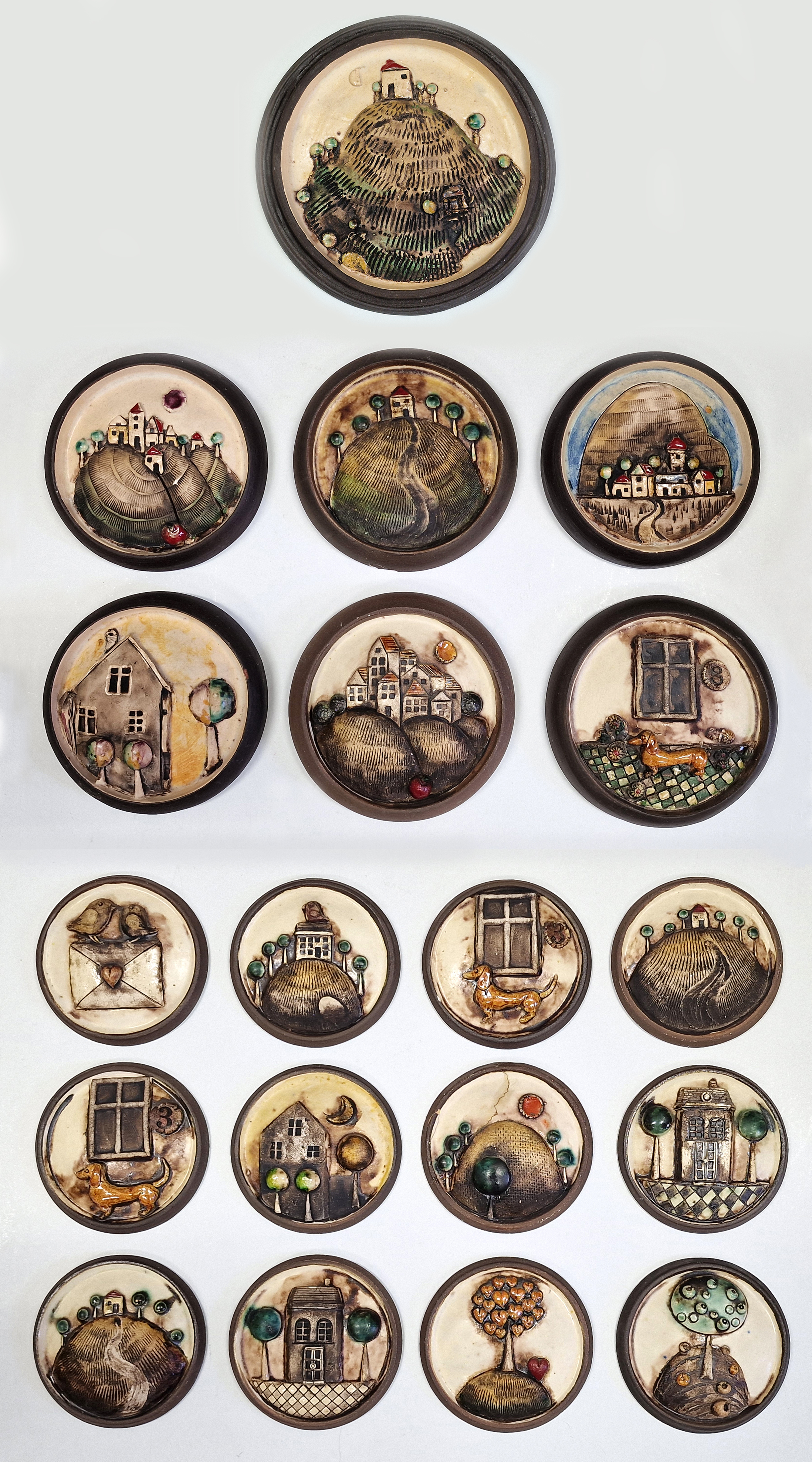 POPIS: 17X pálená hlína, průměry 1 x 18 cm, 6 x 14,5 cm a 12 x 10 cm