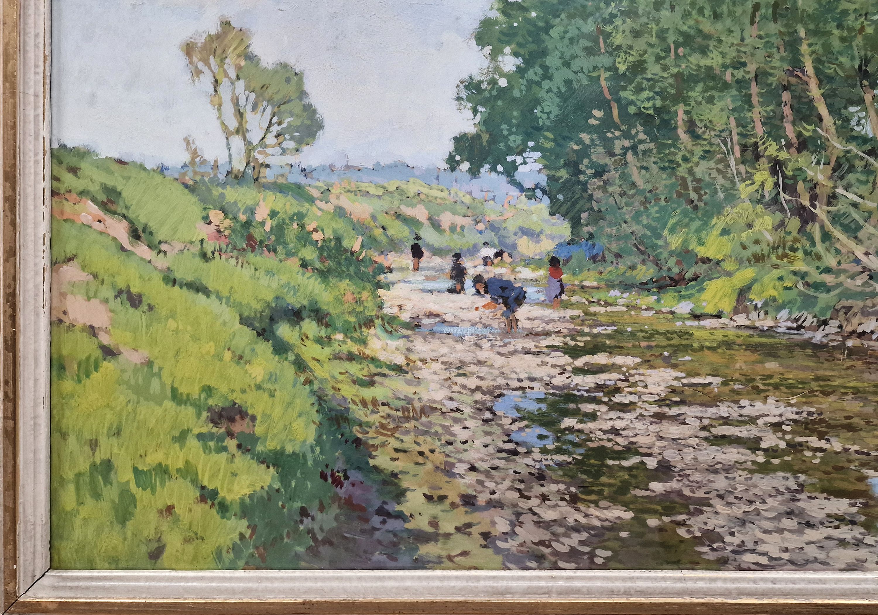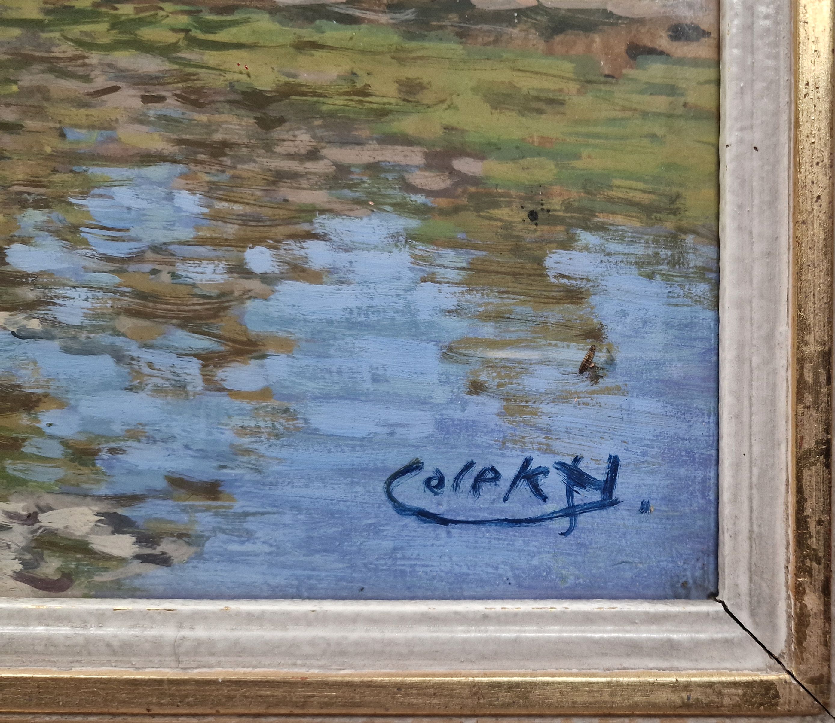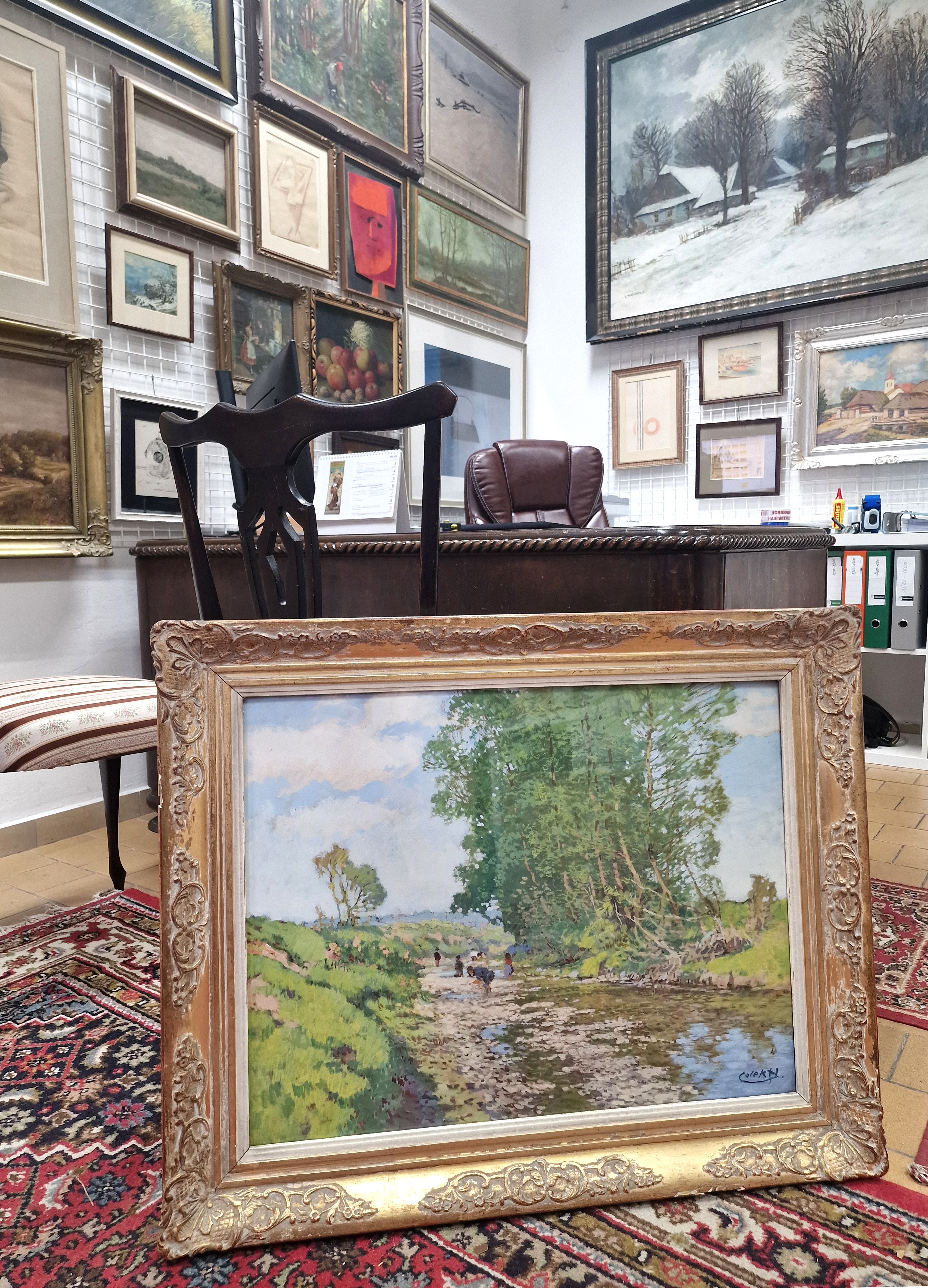 O AUTOROVI: Stanislav Lolek (10. listopadu 1873 v Paloníně – 9. května 1936 v Uherském Hradišti byl český malíř, grafik a ilustrátor, významný žák prof. Julia Mařáka. Studoval v letech 1895–1901 u prof. Julia Mařáka a prof. Rudolfa von Ottenfelda. Absolvoval jarní a letní malířské exkurze na Okoři a v Lochovicích u Zdic. Dle vzpomínek Aloise Kalvody na jarním malířském pobytu v Lochovicích prof. Mařák bolestně snášel Lolkovu sytou barevnost a pravil: "Já vám ten cinggrün musím zkonfiscírovat." Na konci studia St. Lolek obdržel Hlávkovo absolventské cestovní stipendium, a to v letech 1901 a 1902. V následujících letech studoval v Mnichově, pravděpodobně v nově založené soukromé grafické škole u Heinricha Wolffa (1875-1940). Dle Prokopa Tomana studoval u prof. Neumanna a prof. Heinemanna V letech 1903 až 1907 nejčastěji maluje v jižních Čechách (např. Lnáře, Blatná a Mirovice). Rovněž cestuje na hony do Bukoviny a do Ruska. V roce 1906 má první soubornou výstavu v Mladé Boleslavi v nově vybudované Sokolně boleslavské. Příznivou, výstižnou a květnatou kritiku na jeho výstavu píše do Národní politiky (29. 12. 1906) Karel Domorázek-Mráz: "...všude vidíte a cítíte to hřejivé kouzlo koloristní, odvážně uchvacované s pevnou, osobitou jistotou, která už dnes zjevně vystupuje, rozlišujíc Lolka od druhých malířů-krajinářů." Zároveň však varuje před "sklonem k líbivosti, snad i neuvědomělou koncesí přílišnému lyrismu, v níž mohl by utonouti...". Jeho tvorbu po formální stránce významně ovlivnila společná cesta do Francie, Belgie a Německa s Ant. Slavíčkem a Janem Minaříkem v r. 1907. Ant. Slavíčka a jeho choť v roce 1909 doprovází i do Dalmacie. Z těchto cest nejsou známy obrazy malované St. Lolkem. V následné domácí tvorbě se však autor přiklání k impresionismu a k osobité verzi pointilismu. Mezi lety 1907 a 1912 maluje zejména v okolí Telče a na severní Moravě v Lošticích. Po I. sv. válce většinu života strávil v Uherském Hradišti, kde v roce 1931 postavil vilu s ateliérem a v letech 1929–1935 vykonával funkci ředitele Slováckého muzea. Celoživotně sledoval život zvířat. Byl vášnivý nimrod a vlastnil kolibu v revíru u Ružomberku, který měl pronajatý v letech 1921 až 1934. V letech 1896–1900 byl členem Spolku výtvarných umělců Mánes. Následně byl zakládajícím a dlouholetým členem Sdružení výtvarných umělců moravských. Rovněž byl členem Jednoty umělců výtvarných v Praze, zřejmě od. r. 1907. Tyto spolky mu uspořádaly souborné výstavy v letech 1924 a 1934. Roku 1931 byl St. Lolek jmenován řádným členem České akademie výtvarných umění. Zemřel 9. května 1936 v Uherském Hradišti a byl pohřben v rodinné hrobce na hlavním městském hřbitově v Mařaticích. V Praze, v Olomouci a v Zábřehu na Moravě jsou po Stanislavu Lolkovi pojmenovány ulice. Dílo Maloval především krajinu, zvířata a pohledy do parků a zámeckých alejí s figurální stafáží. Jeho krajinářskou tvorbu charakterizovala dobová kritika jako impresionistickou a temperamentní. V době studia na AVU Praze tvořil v duchu střední generace Mařákových žáků (např. Na Litavce pod Plešivcem, Na okraji lesa a Krajina před bouří, vše z r. 1897). Intimní náladová krajinomalba, či symbolistní tematika se odráží například v obrazech Pasoucí se ovce (1900), Jarní krajina (1901) a Smutek v lese (1906). Výrazný zlom v jeho tvorbě nastal po návštěvě Paříže v r. 1907. V impresionistickém duchu maloval např. obrazy Luhačovická alej (1907), V hostinské zahradě (1909) a Železárny vítkovické (1909). Neoimpresionistický dělený rukopis využíval ve svém nejlepším obraze Za humny (Podvečer) z r. 1912. V pozdějším období se jeho tahy štětcem prodlužovaly a bývaly uspořádány do šikmo směřující šrafury ornamentálního vyznění, např. Krajina s Buchlovem, Senoseč (1923), Cikánské baráky (1925) a Pastva podvečer (1933). K pastózně pojaté pointilistické „skvrně“ se překvapivě vrátil v obraze Krajina s kravami z r. 1926, který je v majetku Varšavského národního muzea. K vrcholným dílům pozdního období patří Letní restaurace z r. 1927.