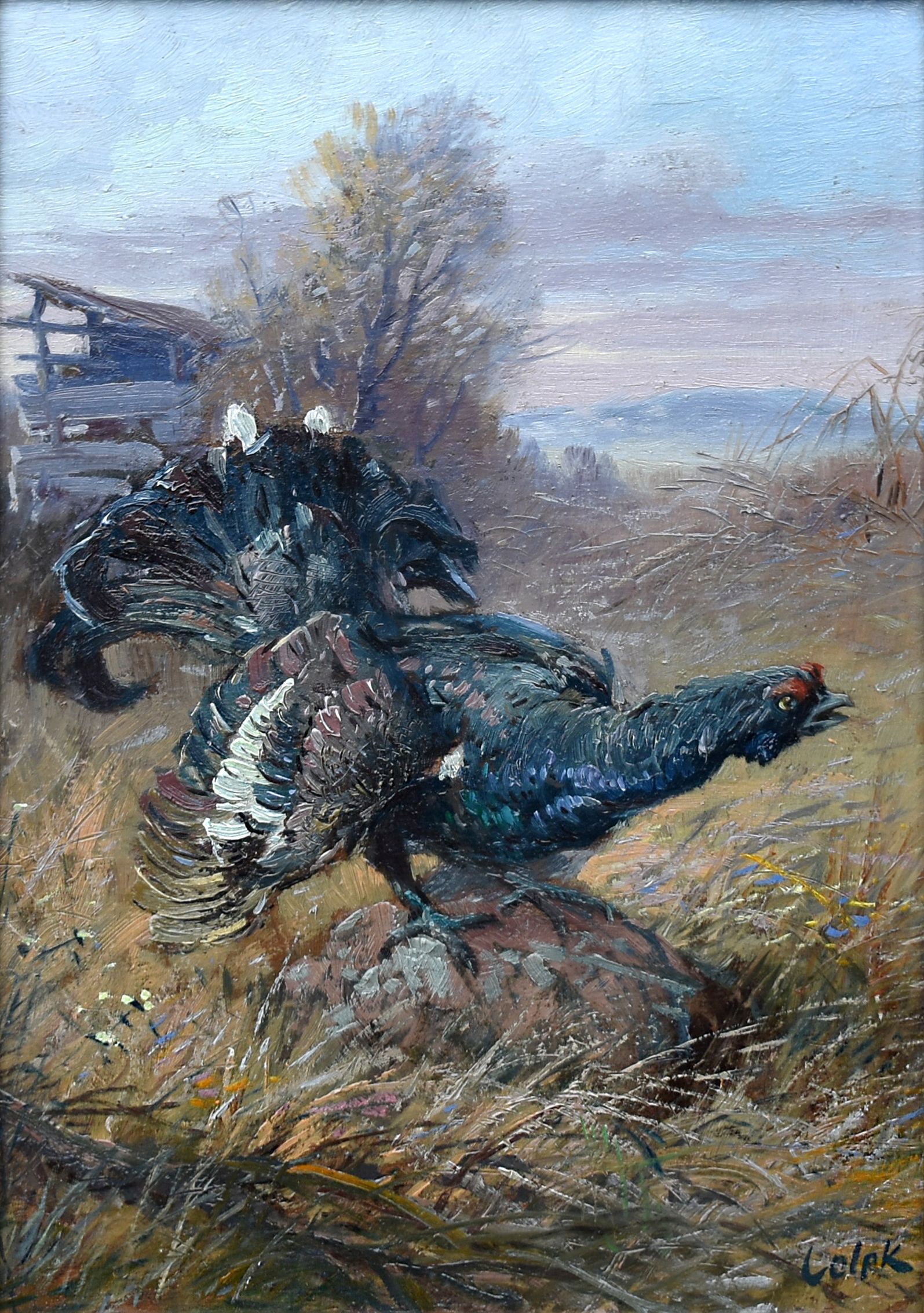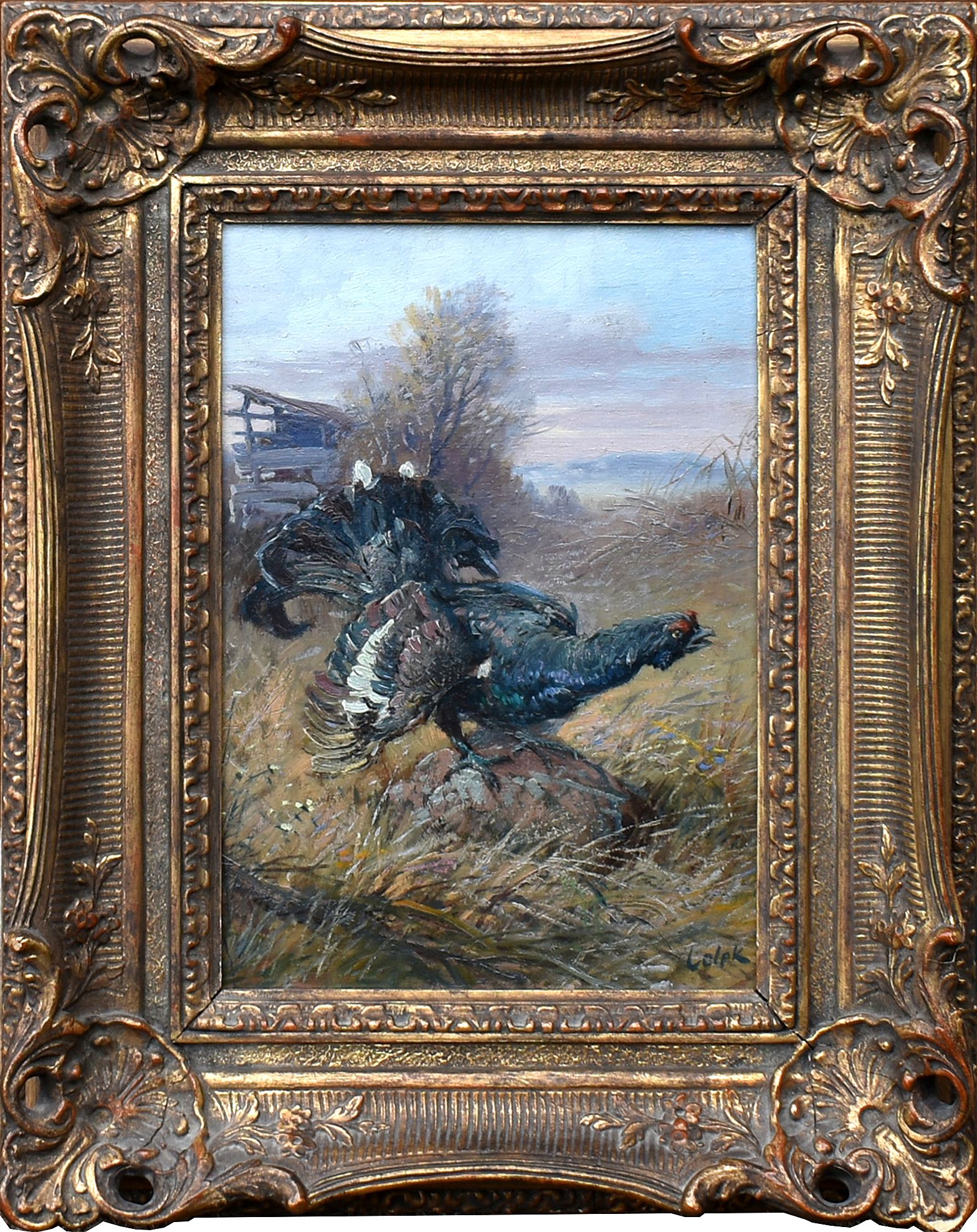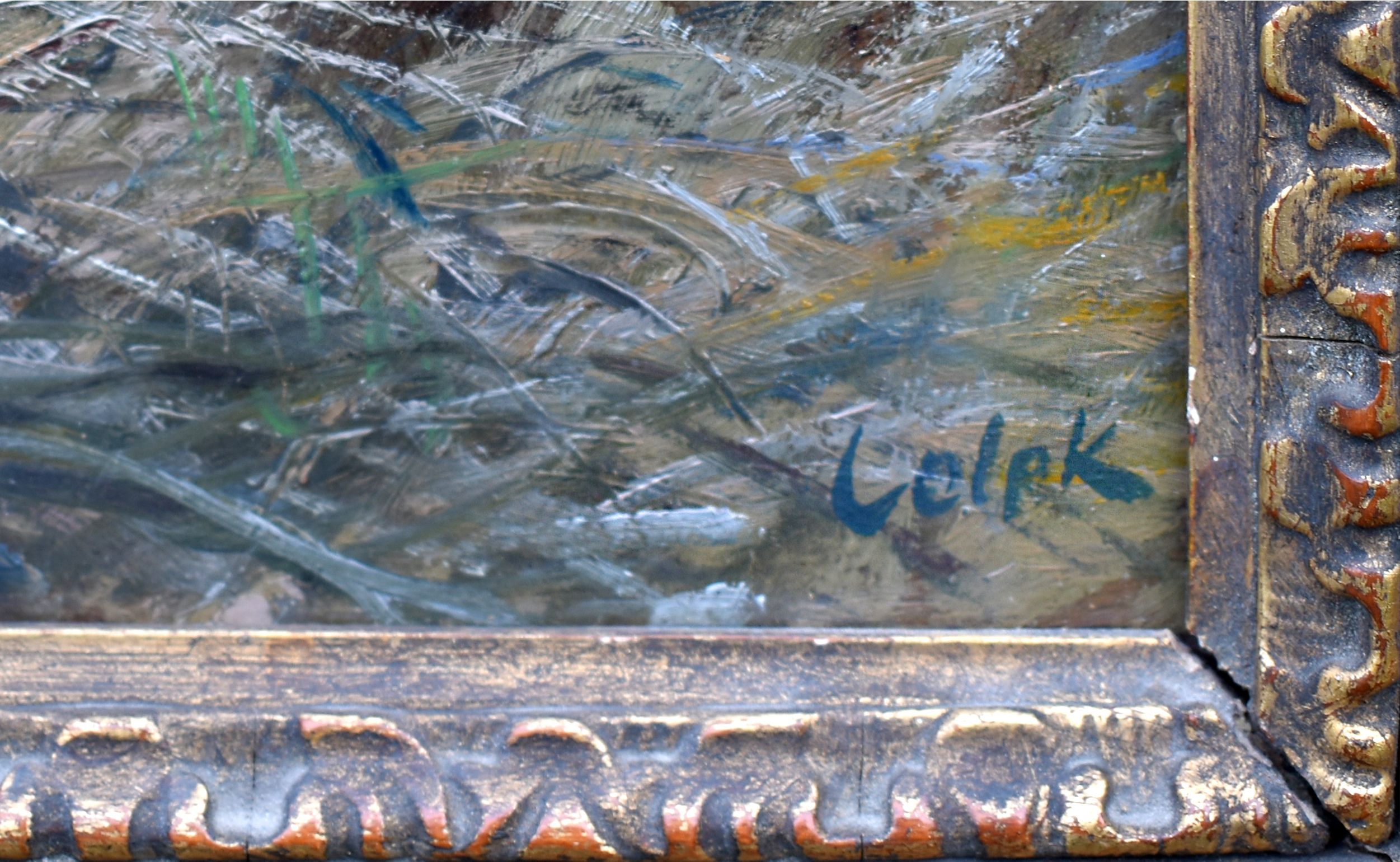 O AUTOROVI: Stanislav Lolek (10. listopadu 1873 v Paloníně – 9. května 1936 v Uherském Hradišti byl český malíř, grafik a ilustrátor, významný žák prof. Julia Mařáka. Studoval v letech 1895–1901 u prof. Julia Mařáka a prof. Rudolfa von Ottenfelda. Absolvoval jarní a letní malířské exkurze na Okoři a v Lochovicích u Zdic. Dle vzpomínek Aloise Kalvody na jarním malířském pobytu v Lochovicích prof. Mařák bolestně snášel Lolkovu sytou barevnost a pravil: "Já vám ten cinggrün musím zkonfiscírovat." Na konci studia St. Lolek obdržel Hlávkovo absolventské cestovní stipendium, a to v letech 1901 a 1902. V následujících letech studoval v Mnichově, pravděpodobně v nově založené soukromé grafické škole u Heinricha Wolffa (1875-1940). Dle Prokopa Tomana studoval u prof. Neumanna a prof. Heinemanna V letech 1903 až 1907 nejčastěji maluje v jižních Čechách (např. Lnáře, Blatná a Mirovice). Rovněž cestuje na hony do Bukoviny a do Ruska. V roce 1906 má první soubornou výstavu v Mladé Boleslavi v nově vybudované Sokolně boleslavské. Příznivou, výstižnou a květnatou kritiku na jeho výstavu píše do Národní politiky (29. 12. 1906) Karel Domorázek-Mráz: "...všude vidíte a cítíte to hřejivé kouzlo koloristní, odvážně uchvacované s pevnou, osobitou jistotou, která už dnes zjevně vystupuje, rozlišujíc Lolka od druhých malířů-krajinářů." Zároveň však varuje před "sklonem k líbivosti, snad i neuvědomělou koncesí přílišnému lyrismu, v níž mohl by utonouti...". Jeho tvorbu po formální stránce významně ovlivnila společná cesta do Francie, Belgie a Německa s Ant. Slavíčkem a Janem Minaříkem v r. 1907. Ant. Slavíčka a jeho choť v roce 1909 doprovází i do Dalmacie. Z těchto cest nejsou známy obrazy malované St. Lolkem. V následné domácí tvorbě se však autor přiklání k impresionismu a k osobité verzi pointilismu. Mezi lety 1907 a 1912 maluje zejména v okolí Telče a na severní Moravě v Lošticích. Po I. sv. válce většinu života strávil v Uherském Hradišti, kde v roce 1931 postavil vilu s ateliérem a v letech 1929–1935 vykonával funkci ředitele Slováckého muzea. Celoživotně sledoval život zvířat. Byl vášnivý nimrod a vlastnil kolibu v revíru u Ružomberku, který měl pronajatý v letech 1921 až 1934. V letech 1896–1900 byl členem Spolku výtvarných umělců Mánes. Následně byl zakládajícím a dlouholetým členem Sdružení výtvarných umělců moravských. Rovněž byl členem Jednoty umělců výtvarných v Praze, zřejmě od. r. 1907. Tyto spolky mu uspořádaly souborné výstavy v letech 1924 a 1934. Roku 1931 byl St. Lolek jmenován řádným členem České akademie výtvarných umění. Zemřel 9. května 1936 v Uherském Hradišti a byl pohřben v rodinné hrobce na hlavním městském hřbitově v Mařaticích. V Praze, v Olomouci a v Zábřehu na Moravě jsou po Stanislavu Lolkovi pojmenovány ulice. Dílo Maloval především krajinu, zvířata a pohledy do parků a zámeckých alejí s figurální stafáží. Jeho krajinářskou tvorbu charakterizovala dobová kritika jako impresionistickou a temperamentní. V době studia na AVU Praze tvořil v duchu střední generace Mařákových žáků (např. Na Litavce pod Plešivcem, Na okraji lesa a Krajina před bouří, vše z r. 1897). Intimní náladová krajinomalba, či symbolistní tematika se odráží například v obrazech Pasoucí se ovce (1900), Jarní krajina (1901) a Smutek v lese (1906). Výrazný zlom v jeho tvorbě nastal po návštěvě Paříže v r. 1907. V impresionistickém duchu maloval např. obrazy Luhačovická alej (1907), V hostinské zahradě (1909) a Železárny vítkovické (1909). Neoimpresionistický dělený rukopis využíval ve svém nejlepším obraze Za humny (Podvečer) z r. 1912. V pozdějším období se jeho tahy štětcem prodlužovaly a bývaly uspořádány do šikmo směřující šrafury ornamentálního vyznění, např. Krajina s Buchlovem, Senoseč (1923), Cikánské baráky (1925) a Pastva podvečer (1933). K pastózně pojaté pointilistické „skvrně“ se překvapivě vrátil v obraze Krajina s kravami z r. 1926, který je v majetku Varšavského národního muzea. K vrcholným dílům pozdního období patří Letní restaurace z r. 1927. Zastoupení ve sbírkách Národní galerie v Praze, např. obrazy Na pastvě (1903) a Za humny (1931) Moravská galerie v Brně, např. obrazy Smutek v lese (1906) a Železárny vítkovické (1909) Galerie výtvarného umění v Hodoníně, např. obrazy Trh v moravském městě (1899), Za humny (Podvečer) (1912), Krajina s ovcemi a Tůň v lese Muzeum umění Olomouc, např. obrazy Krajina před bouří (1897), Luhačovická alej (1907) a Lesní krajina se srnkami Krajská galerie výtvarného umění ve Zlíně, např. obrazy V hostinské zahradě (1909) a Lesní interiér Galerie Středočeského kraje, obrazy Kaštanová alej v Mladé Boleslavi, Stromová alej a Louka Galerie výtvarného umění v Ostravě, např. obrazy Večerní krajina (1905) a Pohled na Uh. Hradiště a Alej v Luhačovicích (1923)