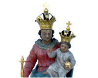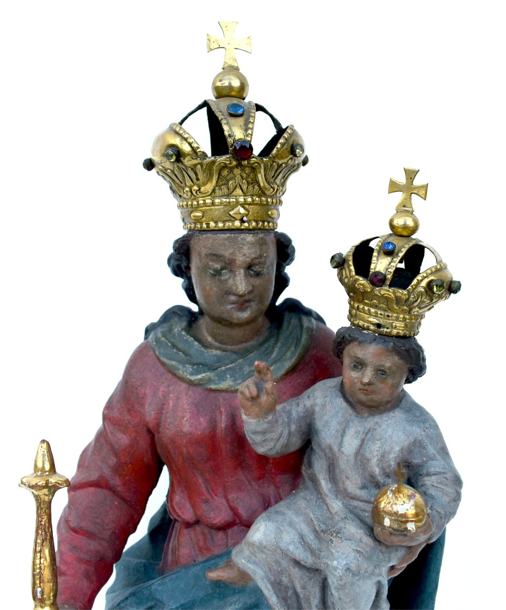 POPIS: Dřevěná plastika, koruny: žlutý kov, sklo, výška : 53 cm