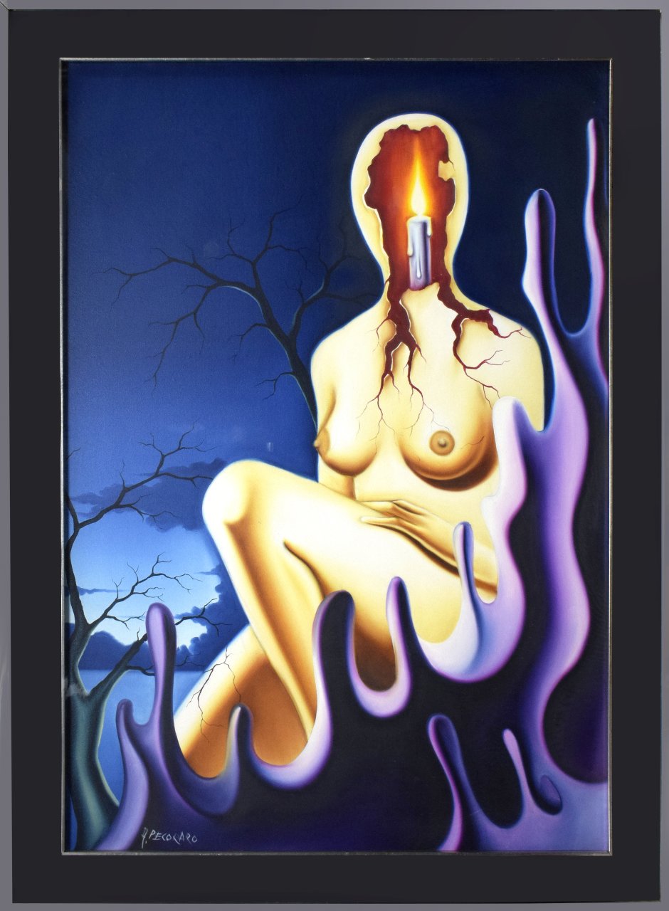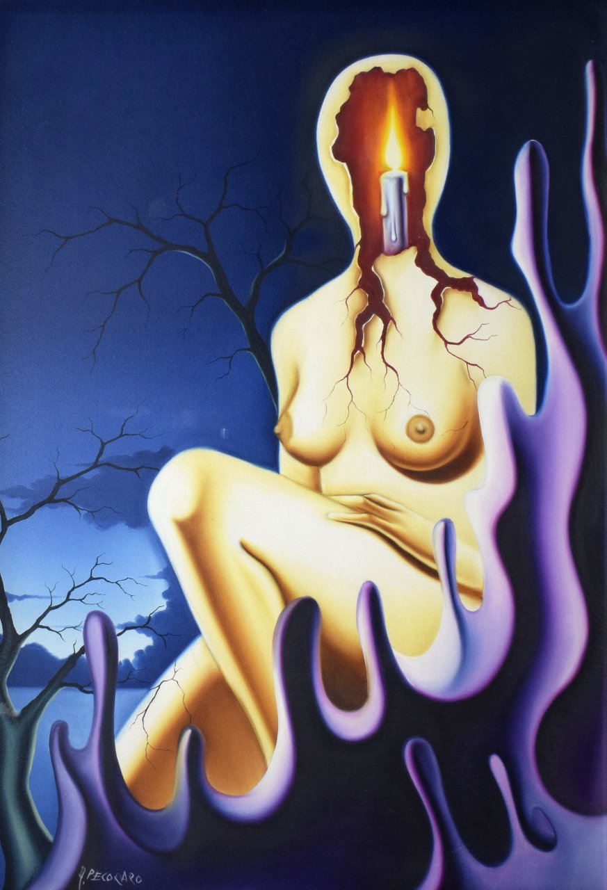 O AUTOROVI: Achille Pecoraro, narozený v Gela (CL), pracuje v Janově, Sestri Ponente. Narodil se v Gela (Caltanisetta) a do svých 19 let navštěvoval školu "Giorgio Arcoleo" v Neapoli. V letech 1968-69 přešel na Akademii výtvarných umění v Sao Paulu v Brazílii, kde nějakou dobu pobýval, realizoval různé osobní výstavy a získal značný ohlas kritiky i veřejnosti. Po návratu do Janova pracoval dlouhou dobu ve studiu na Via Trebisonda. Žije v Sestri Ponente, kde je vysoce ceněn pro svůj umělecký talent. Po dlouhém a bolestném uměleckém mlčení je předloženo skutečné drama, které často zasáhne, vždy z vážných důvodů, skutečné umělce, umělce s velkým A, s novou a bohatou produkcí zvláštní hodnoty. Umělecký proud, k němuž se surrealismus přiklání, s implikacemi pro metafyzično. Na přání však maluje dokonalé portréty, a to jak pro obrazovou techniku, tak pro výsledné expresivní výsledky. Zvláštní virtuozitu dosahuje v zobrazení posvátného charakteru nebo v některých pohádkových krajinách v jemných barvách, kde světlo vždy proniká a zahřívá celekexpresivní text. Evokující pohled na Janov s lucernou, když se rozsvítí světla při západu slunce, proti oslnivé obloze, ale je hvězda slunce nebo měsíc? V popředí dva výrazy stejné krásné tváře ženy, i když s jistou nejednoznačností v přední poloze. Nádherné město se ukazuje se svými emblematickými klenoty v tiché hodině, s melancholií, odhalující se ve své provokativní smyslnosti, která však odhaluje trpící spiritualitu, převedenou do kombinace barev mezi růžovou a modrou, které dobře vyjadřují překročení hmoty ve snové říši. Vzhled, krásy, tajemství. "Tak to je, jestli chceš." Vybroušené metafyzické abstrakce rafinované kresby. Rušivé nejistoty mezi hmotou a hmotou. Polootevřená kniha s několika překlady do jazyků z jiných světů. Můžeme říci, že Achille Pecoraro ve svých obrazových textech rád odbočuje, využívá svých náladových dovedností, pečlivě se zabývá různými poznámkami a vytváří koncert intenzivních výrazů, které se stávají jeho klíčem ke čtení zpracovaného tématu. Skutečnost se stává surrealistickým a naopak, umělec jistě touží téměř dychtivě transponovat to, co cítí, za hranice představitelného a viditelného. Vše, co jsme dosud řekli o A. Pecorarovi, je pouze jeho světlá stránka, ta měsíční tvář, kterou můžeme obdivovat, když je noční obloha jasná. Umělec je také takzvaný černý měsíc, okultní, a to je strana, která mu nejvíce vyhovuje. Jeho pravé ego nebo Alter Ego, které dává velkou hodnotu těmto instinktivním skóre nebo deliriózním kloubům. Absolutní mistr perspektivy, cestuje ve světě, kde převládá "zlo života", Prostřednictvím hororově-metafyzicko-surrealistického rozkladu lidských částí na vyprahlých územích, kde všude číhají praskliny, s koulemi vznášejícími se v prostoru, gigantickými očními bulvami, nejasnými humanoidními formami rozbité nebo propíchnuté hmoty, dotěrnou krví kapající sem a tam atd. Hermetický jazyk těchto ne-nedávných obrazů je vždy velmi aktuální a křičí po znečištění, násilí, pomíjivosti, domýšlivosti, pýše, skenování času v nečase. Tyto přemýšlivé vjemy pulzují negativně ironickým chladem. 70. LET VÝSTAVY: 1969-1970 – Osobní galerie "Agenda" Av. W. 3 Q. 704/705 na č. 47 Brasilia-DF - Brazílie. 1970- Osobní výstava v Galerii "Rocha"- Praça das Bandeìras 374 Sao Paulo – Brazílie 1970- Cena "O Cangaseiro" 1970- Recìfe - Brazílie 1971 - Osobní výstava v Galerii "Il Pennellaccio" - Cagliari 1973 - Kolektiv v Galerii "Inter-Arte" - via XX Settembre - Janov 1974 - Osobní výstava v Galerii umění "Torre" - Turín 1974- Osobní výstava v Galerii umění "Asso di Quadri" - Alassio 1974- Ocenění Čestná plaketa pana Macchiavelliho, na soutěži "ženský akt dnes" - Janov. Psali o něm italští i zahraniční kritici umění; Jeho díla jsou publikována a recenzována nejvýznamnějšími uměleckými katalogy. Je přítomen ve veřejných a soukromých sbírkách v Itálii, Brazílii atd. Kritika Pecoraro má oko pro metafyziku a oko pro surreálno, ale zatímco modernímu kritikovi se metafyzická malba jeví