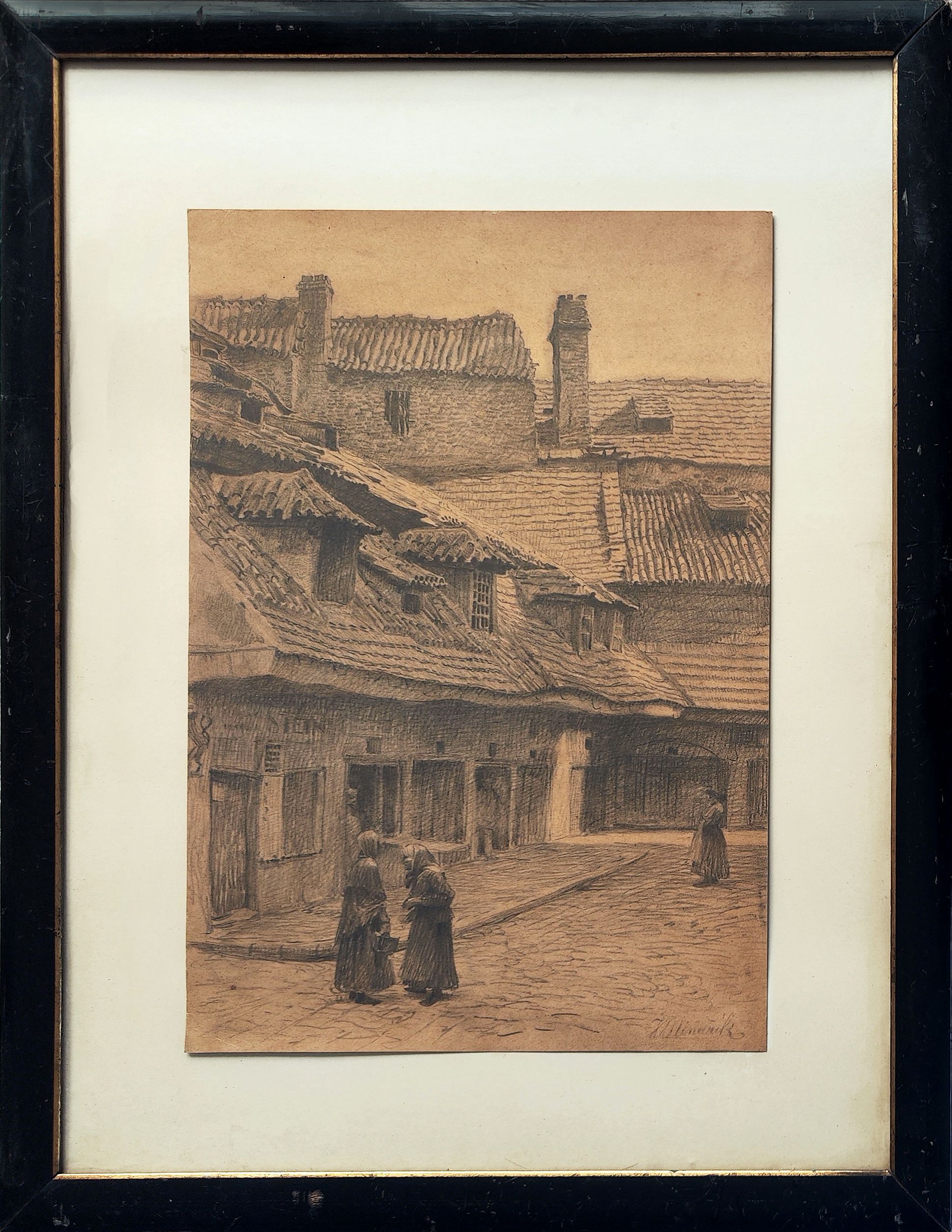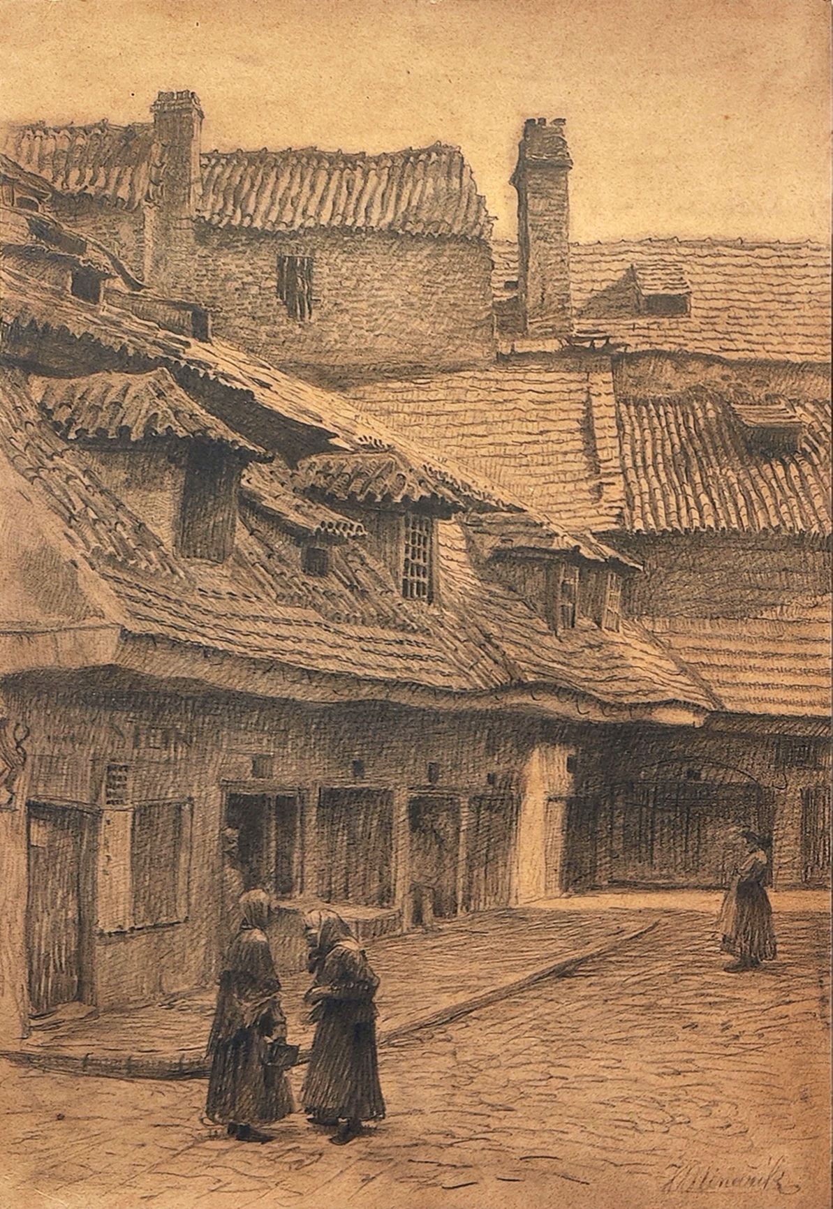 POPIS: Kresba tužkou, rozměry kresby: 34 x 23,5 cm, na poslední příloze Ilustrační foto pohlednice : Židovské masné krámy.