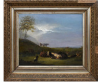 POPIS: Olej na dřevě rozměry: 42 x 52 cm. Deska zpevněna roštem, poškozený rám