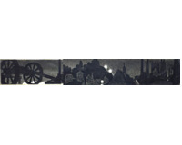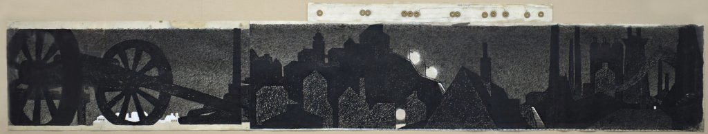 POPIS: Kombinovaná technika (tuš + běloba + pastelky), celkový rozměr včetně rámu 52 x 195 cm, dílo kryté plastem. Návrh k filmu: O milionáři, který ukradl slunce