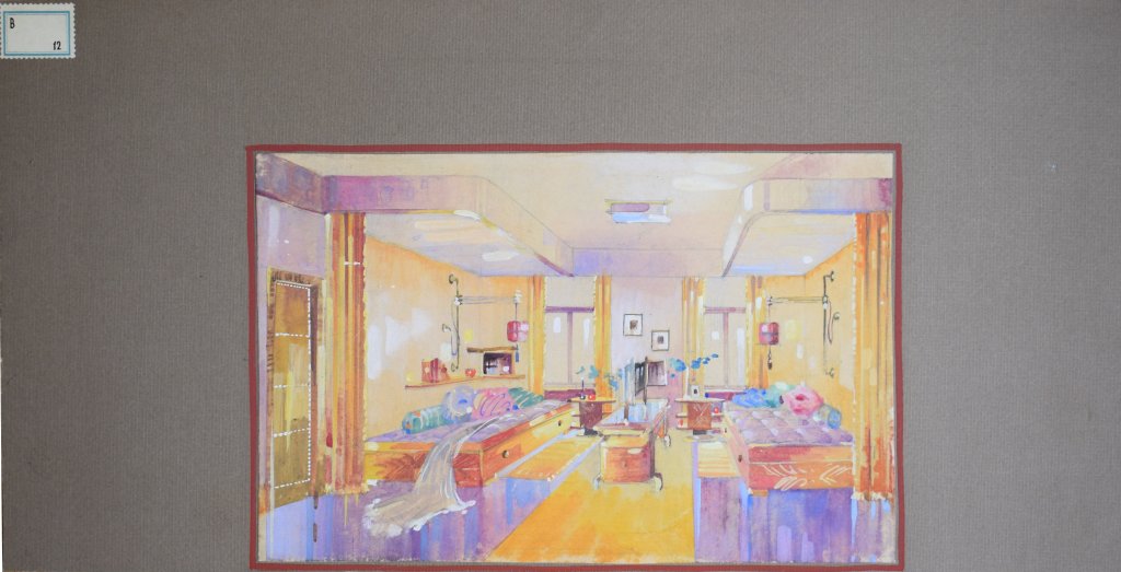 POPIS: Akvarel, rozměr malby 15 x 23, celkové rozměry s podložkou 21 x 42 cm. Návrh interieru 30.tá léta. Štítek návrhu č. 12, nerámováno. Dílo získáno z rodiny autora.
