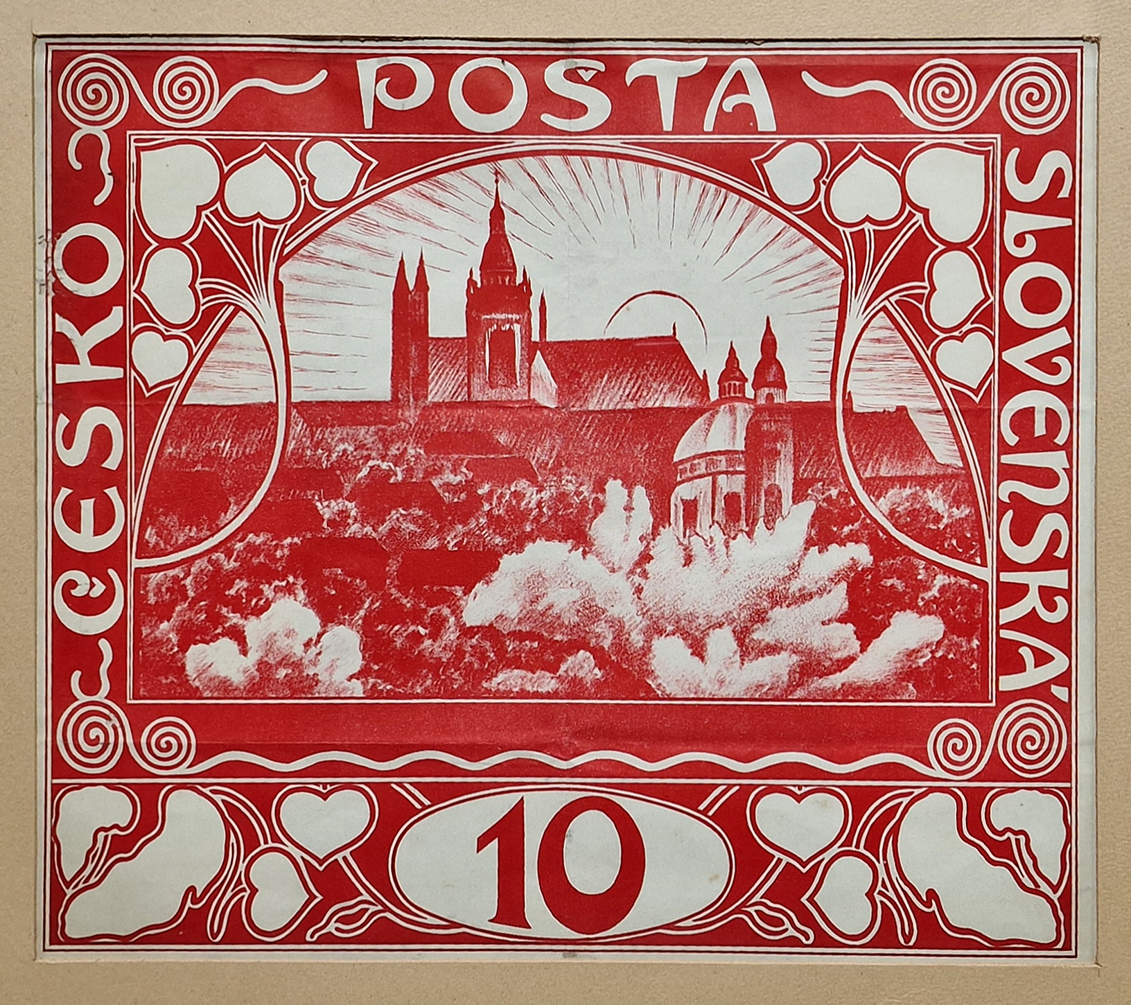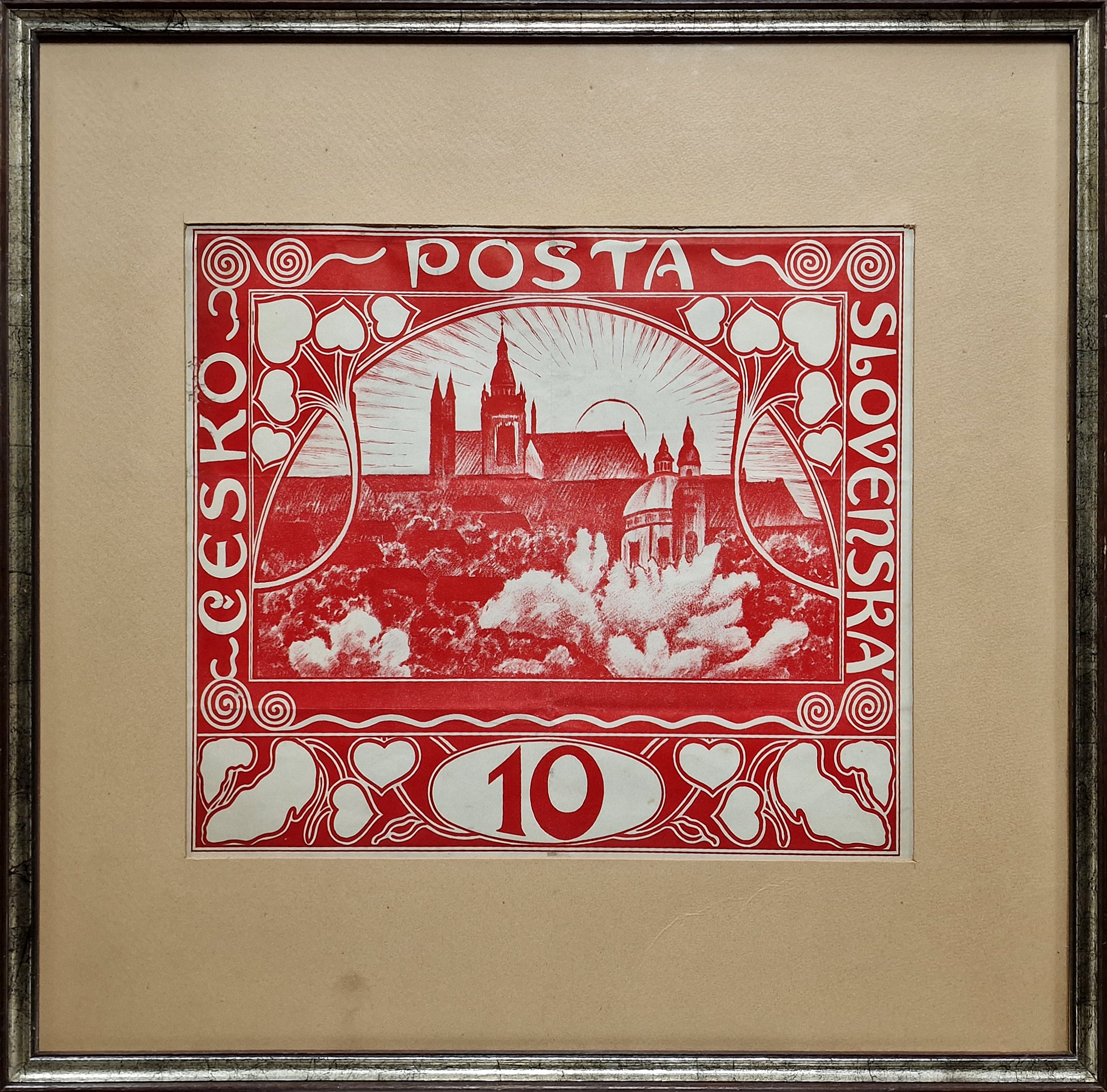 POPIS: Umělecký tisk na papíře, známka v nominální hodnotě 10 haléřů, rozměr ve výřezu 32 x 39 cm, zaskleno, mírně poškozeno