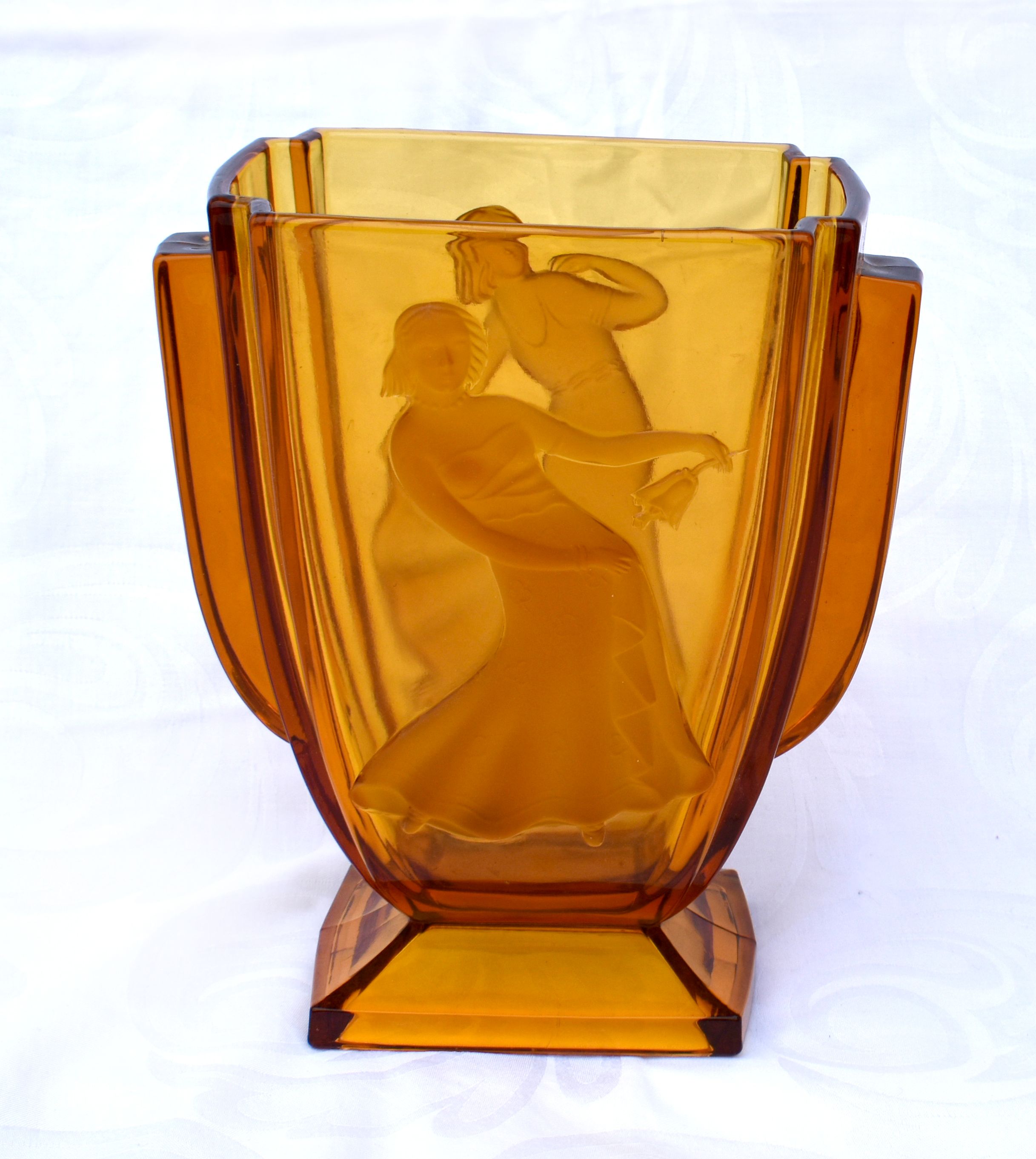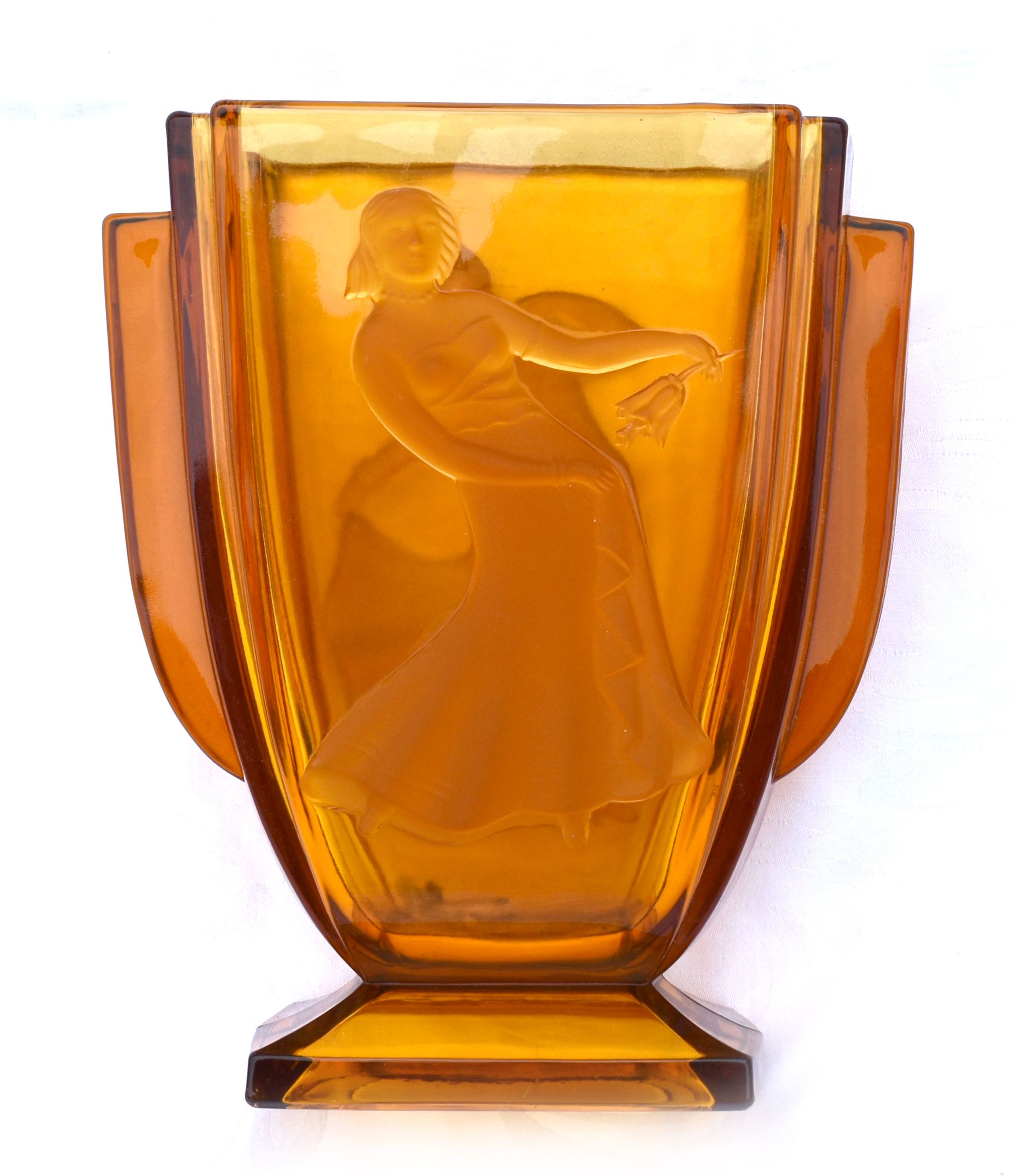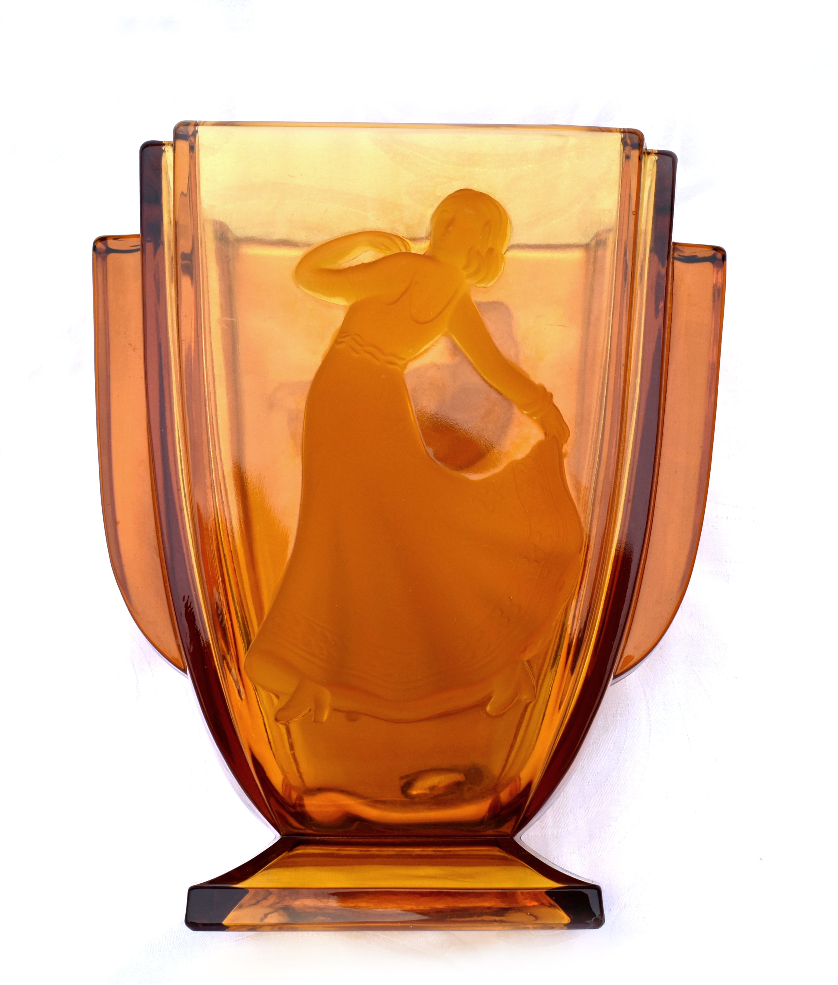 POPIS: Skleněná váza s figurálním motivem, výška: 22,5 cm, šířka: 19 cm