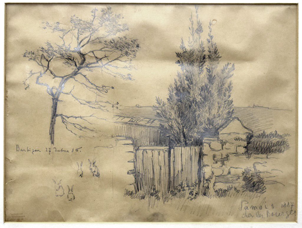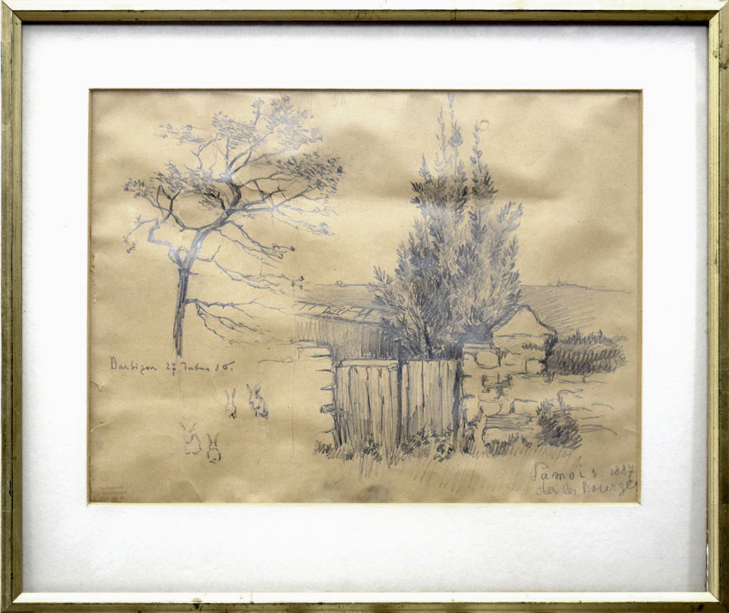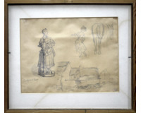 POPIS: Kresby tužkou, rozměry 27,5 x 37 cm, jednostranně zaskleno, silně poškozeno. Označeno pozůstalostním razítkem.