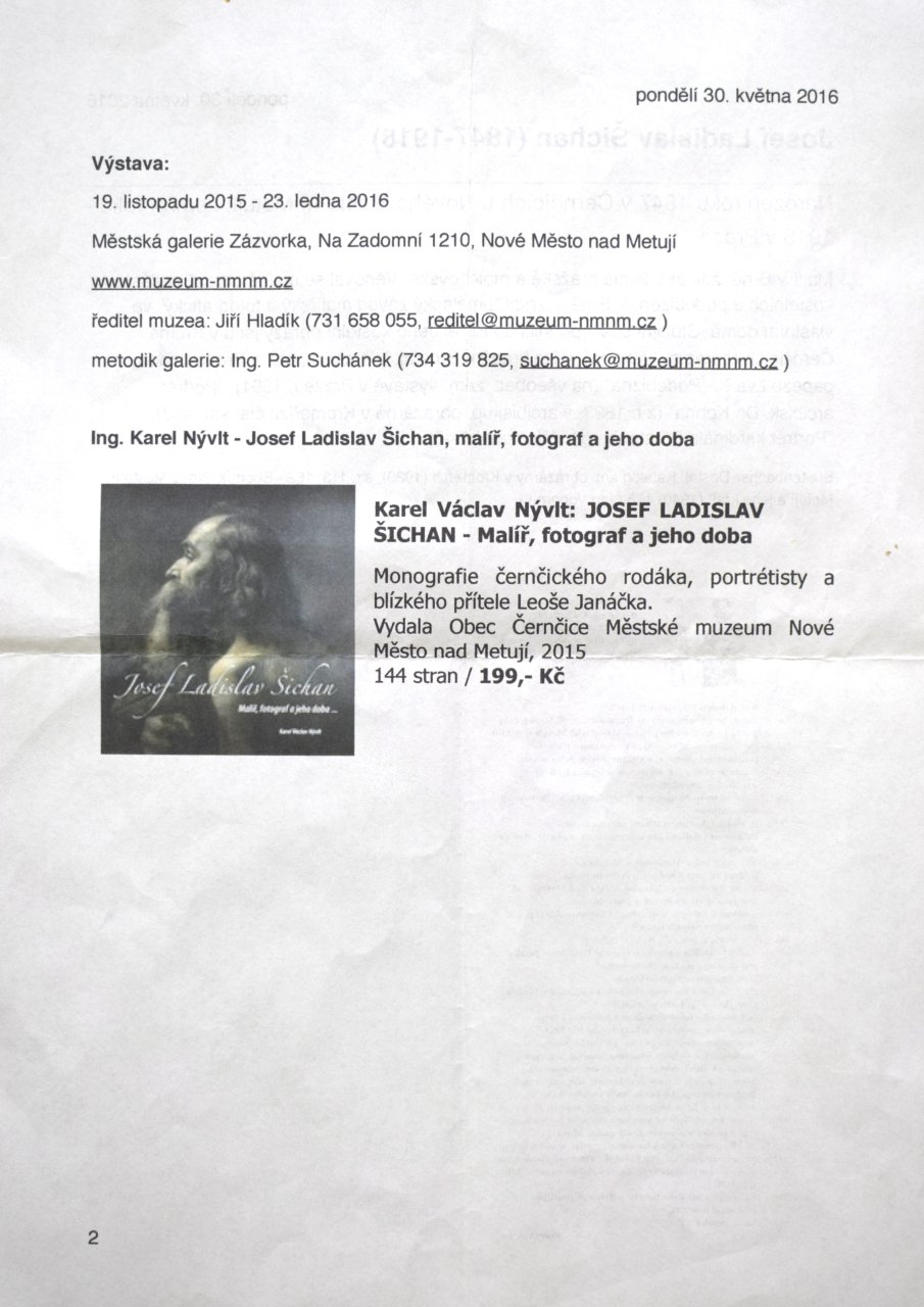 O AUTOROVI: 5.9.1847 Černčice – 19.12.1918 Královské Vinohrady byl český malíř a fotograf Josef Ladislav Šichan se narodil v malebné podhorské obci Černčice v rodině bednářského mistra Josefa Šichana. Kněz který malého Josefa Ladislava křtil u něho objevil záhy umělecké vlohy. Josef Šichan navštěvoval obecnou a následně reálnou školu v Novém Městě nad Metují. Díky nadání, vlastní píli a podpoře svého štědrého mecenáše děkana J.K.Rojka byl přijat na pražskou malířskou akademii. Zde úspěšně studoval společně s budoucími uměleckými osobnostmi, jako např. V. Brožíkem, F. Ženíškem, J. Myslbekem, M. Alšem a dalšími. Následně studoval i na malířské akademii v Mnichově a absolvoval několik studijních cest po Evropě. Svůj první malířský ateliér měl v Brně, byl vyhledáván jako osvědčený, seriózní malíř portrétista a tvůrce obrazů s náboženskou tematikou. Roku 1883 namaloval kopii významného gotického obraz známého pod názvem "Zašovská Madona". V roce 1884 se oženil s Pavlínou Nouzovou z Rajhradu. Během svého brněnského pobytu udržoval úzké vazby z Milosrdnými bratry, z benediktiny v Rajhradě a z brněnskými augustiniány. Přátelil se z Leošem Janáčkem a byl svědkem na jeho svatbě se Zdenou Scholzovou. Na konci 19. století se Josef Šichan i s rodinou přestěhoval do Prahy na Královské Vinohrady, kde se dál věnoval jak malbě, tak průkopnické portrétní fotografii. Zde také krátce po vzniku republiky 19. prosince 1918 zemřel. Pohřben byl na Vinohradském hřbitově. Během svého plodného života portrétoval mimo jiné i Leoše Janáčka, Antonína Dvořáka, Jindřicha Mošnu a Karolínu Světlou. Dále ztvárnil portréty arcibiskupa Theodora Kohna, kardinála Františka Bauera a další známé osobnosti tehdejšího života. Zdroj: Wikipedia