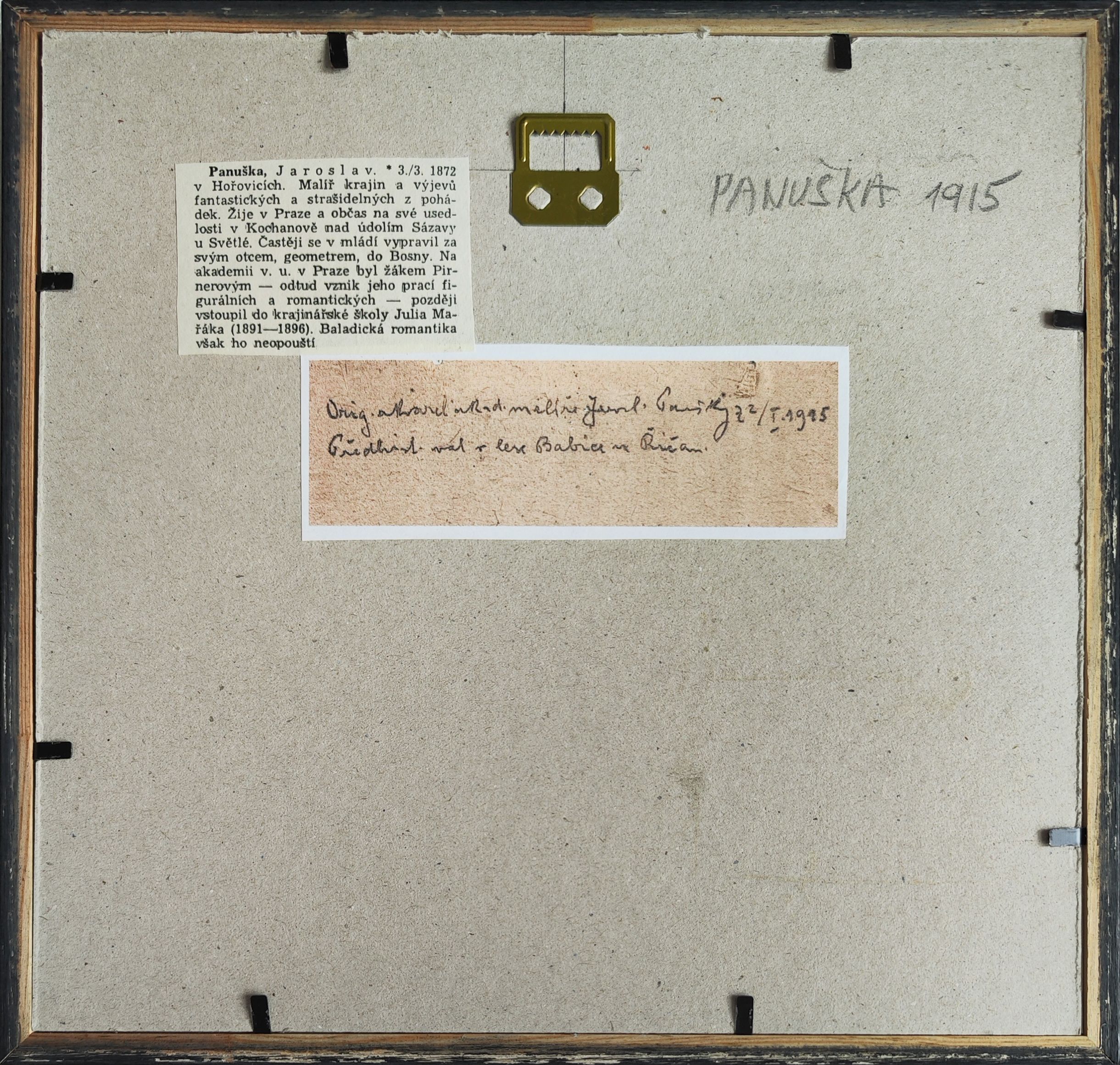 O AUTOROVI: Narodil se 3. 3. 1872 v Hořovicích a zemřel 1. 8. 1958 v Kochánově nad Sázavou. Malíř krajin a fantastických a strašidelných pohádkových výjevů. Studoval na pražské Akademii u Julia Mařáka v letech 1892 - 1898 a u Maximiliána Pirnera v letech 1889 - 1890. V letech 1887 - 1889 pobýval u otce pracujícího jako geometr v Bosně. Roku 1889 cestoval do Drážďan a Mnichova. Za otcem na Balkán jel opět roku 1890 a 1893, kdy navštívil i Benátky. Od roku 1926 trvale žil v Kochánově nad Sázavou. Typická je pro něj tvorba z přelomu století, která se váže k symbolismu a která obohacuje úzkostné a strašidelné vize o groteskní polohu. Časté jsou i pohádkové motivy. Roku 1905 vyšla kniha Letní noc V. Říhy, k níž vytvořil obrazový doprovod. Vedle toho maloval zhruba od roku 1907 koloristicky bohaté, impresivně laděné krajiny. Jeho záliba v historii a archeologii se promítla i do obrazů inspirovaných minulostí a obrazových rekostrukcí pravěkých sídlišť a starých památek. (Tomanův slovník, Julius Mařák a jeho žáci, katalog k výstavě)