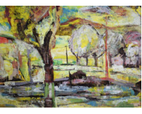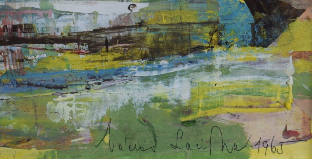 POPIS: Olej na lepence, rozměr ve výřezu 42,5 x 69,5 cm + pasparta a rám, zaskleno, signováno Václav Lacina 1963.