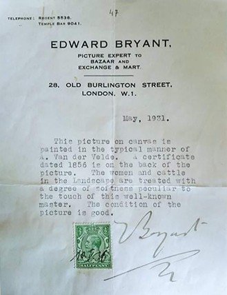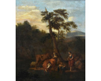O AUTOROVI: Adriaen van de Velde ( 30. listopadu 1636, Amsterdam - bur. 21. ledna 1672, Amsterdam), holandský malíř zvířat a krajiny , syn Willema van de Veldeho staršího a bratr Willema van de Velde mladšího , námořní malíř. Adriaen se nechtěl stát námořním malířem, a tak byl vycvičen ve studiu krajináře Jana Wynanse . Tam se seznámil s Philipem Wouwermanem , o kterém se předpokládá, že mu pomáhal při studiu zvířat, a že na jeho umění měl silný a prospěšný vliv. Poté, co dosáhl mimořádně rychlého pokroku, byl brzy zaměstnán svým pánem, aby vnesl postavy do svých krajinných kompozic, a poskytoval podobnou službu Hobbemovi , Ruisdaelovi , Verboomovi a dalším současným umělcům. Podle Houbrakena zemřel ve spolupráci s Janem van der Heydenem a Frederikem de Moucheronem, malování zvířat na jejich obrazy. Mezi jeho oblíbené předměty patřily výjevy z otevřené pastviny s ovcemi, dobytkem a kozami, které prováděl obratně, s velkou přesností dotyku a pravdou ve stylu kresby, a s jasným stříbřitým zbarvením. Maloval několik malých zimních scén s bruslaři a několik náboženských předmětů, například Sestup z kříže , pro římskokatolický skrytý kostel v Amsterdamu a The Migration of Jacob (1663, Wallace Collection Kromě svých obrazů, z nichž bylo katalogizováno téměř dvě stě, provedl asi dvacet leptů , z nichž některé se podle jejich dat dělaly v jeho čtrnáctém ročníku. Vyznačují se přímostí metody a jemností a jistotou dotyku. Van de Velde žil v Kalverstraat , poblíž Regulierspoort .