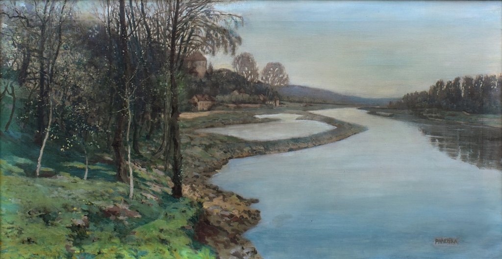 POPIS: Olej na plátně, rozměry: 51 x 96 cm, malba poškozená, zaskleno. Ranná malba před rokem 1900. Obraz prošel částečnou rekonstrukcí.