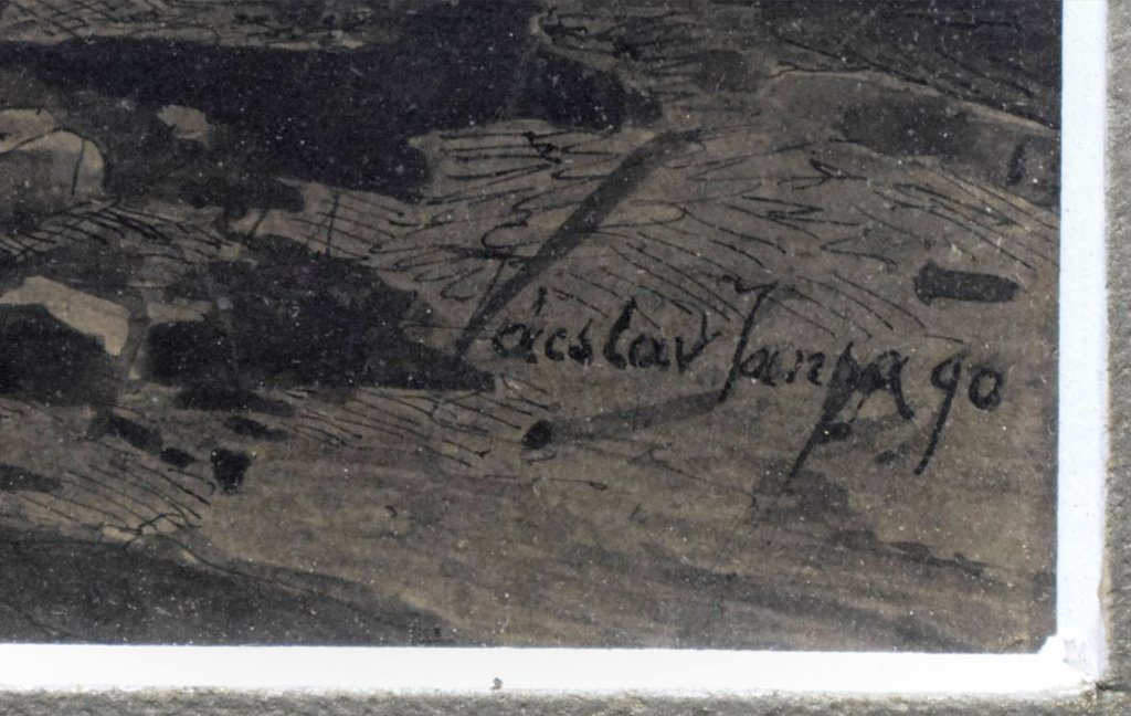 POPIS: Lavírovaná tuš + běloba, rozměr výřezu 27 x 37 cm, zaskleno, datováno 1890