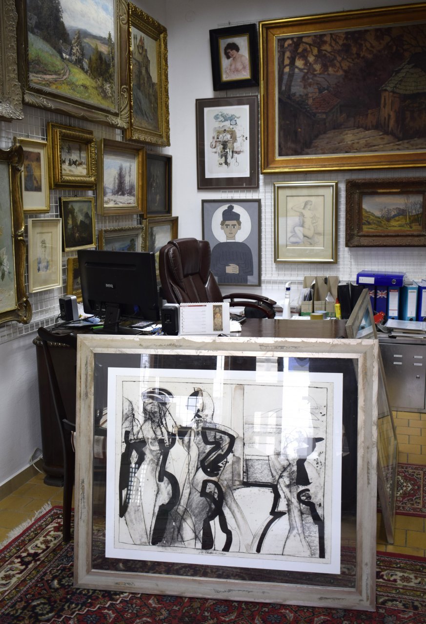 POPIS: Kombinovaná technika na papíře, rozměr listu 70 x 85 cm, rozměr včetně rámu 94 x 109 cm. Dílo oboustranně zaskleno, nově rámováno