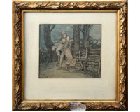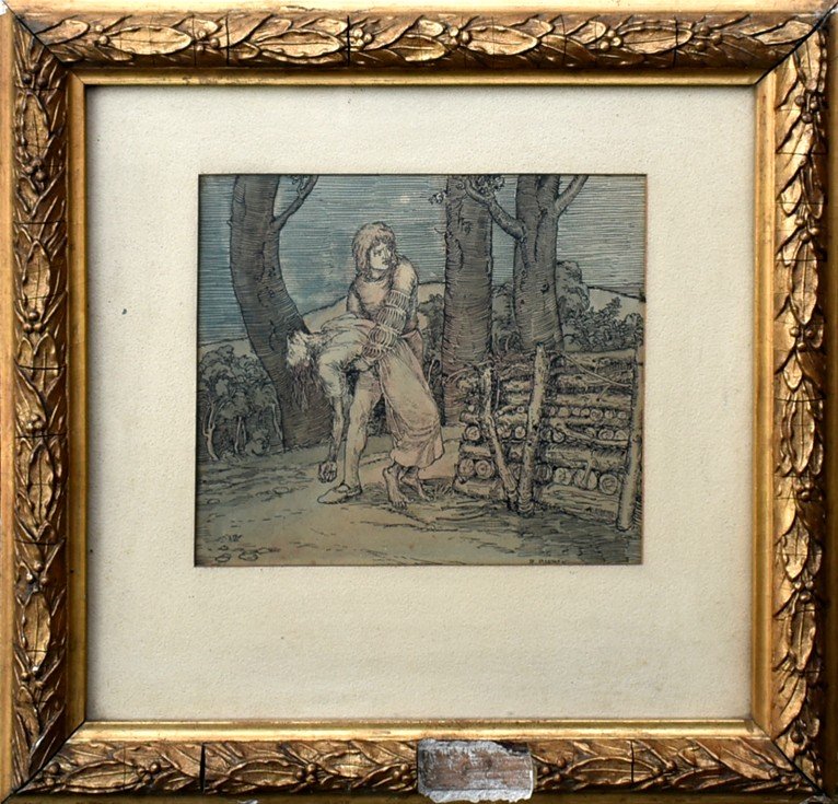 POPIS: Kolorovaná perokresba, rozměry ve výřezu pasparty: 16 x 18,5 cm, zaskleno, poškozený rám. Vzadu číslo z výstavy nakladatelství Edvard Beaufort