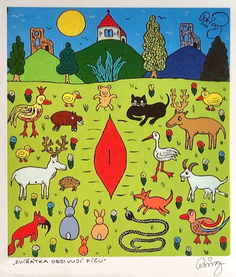 POPIS: Olej na plátně, rozměry : 60 x 75cm, rozměry včetně rámu : 75 x 90 cm. Na rubu plátna věnování od autora s přípisem : Milé ... .... Ringo ( Všech volů futrál ) Dar autora. + Tři grafické listy a 1x litografie -Zvířátka obdivují P--u.