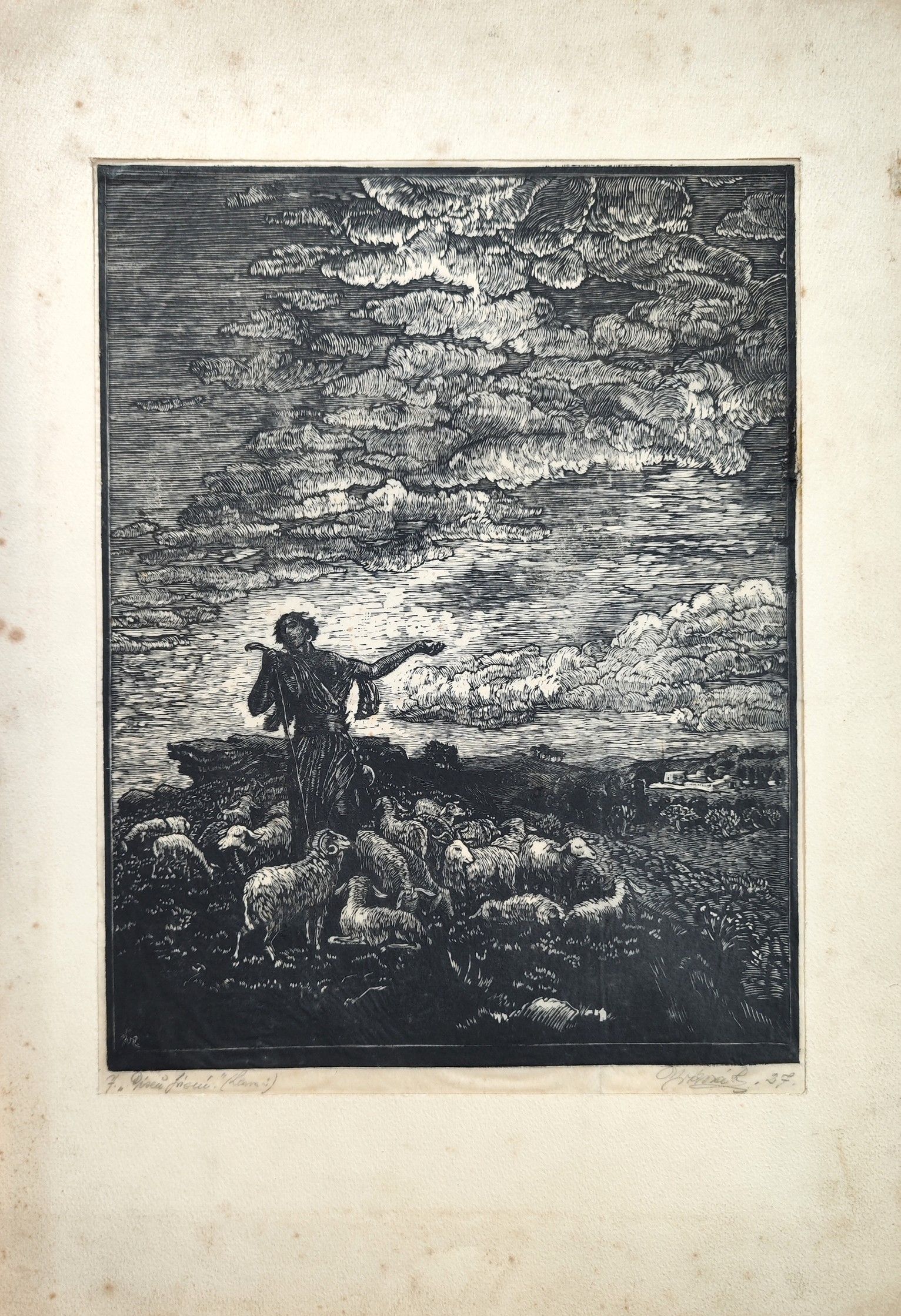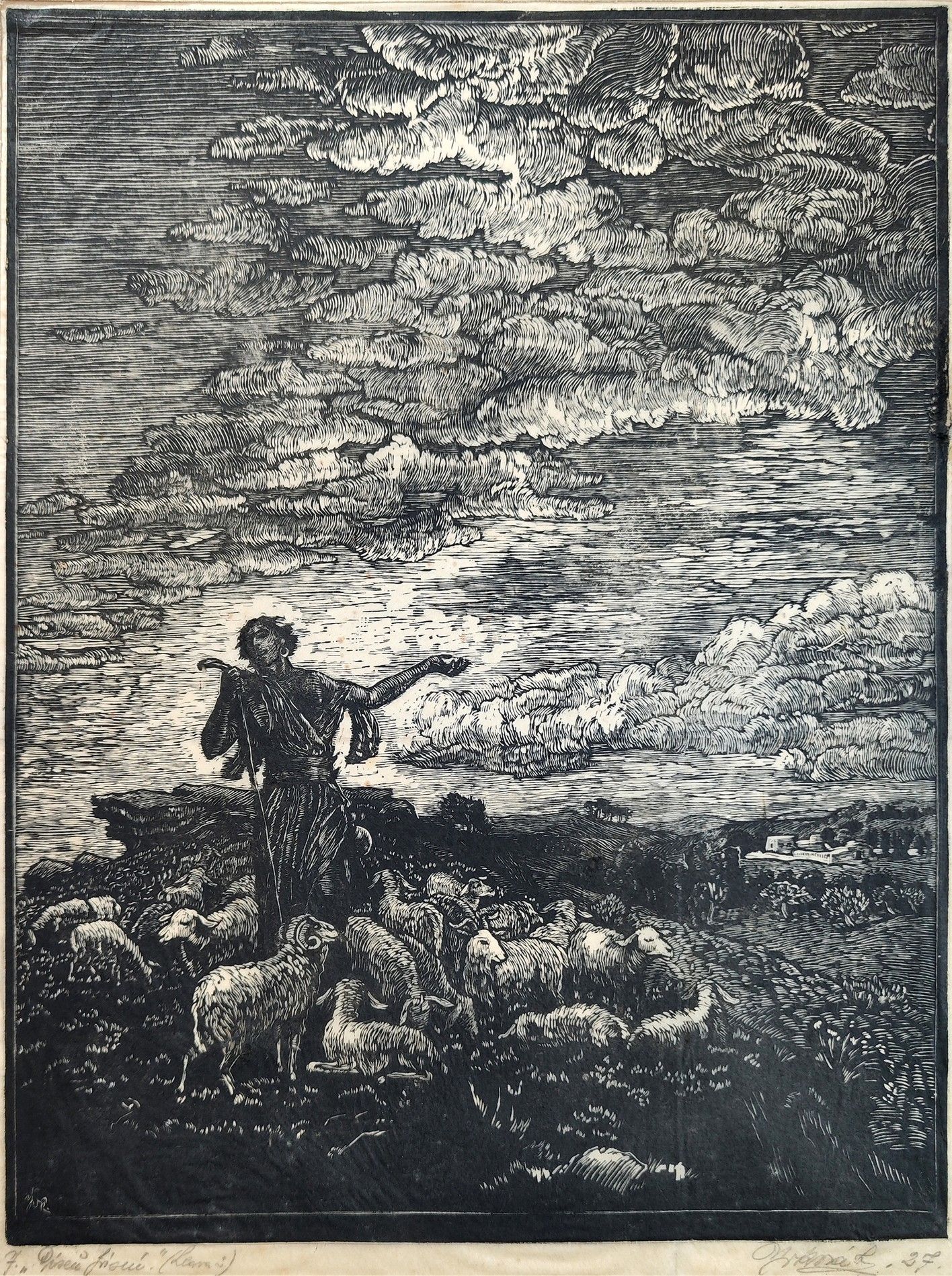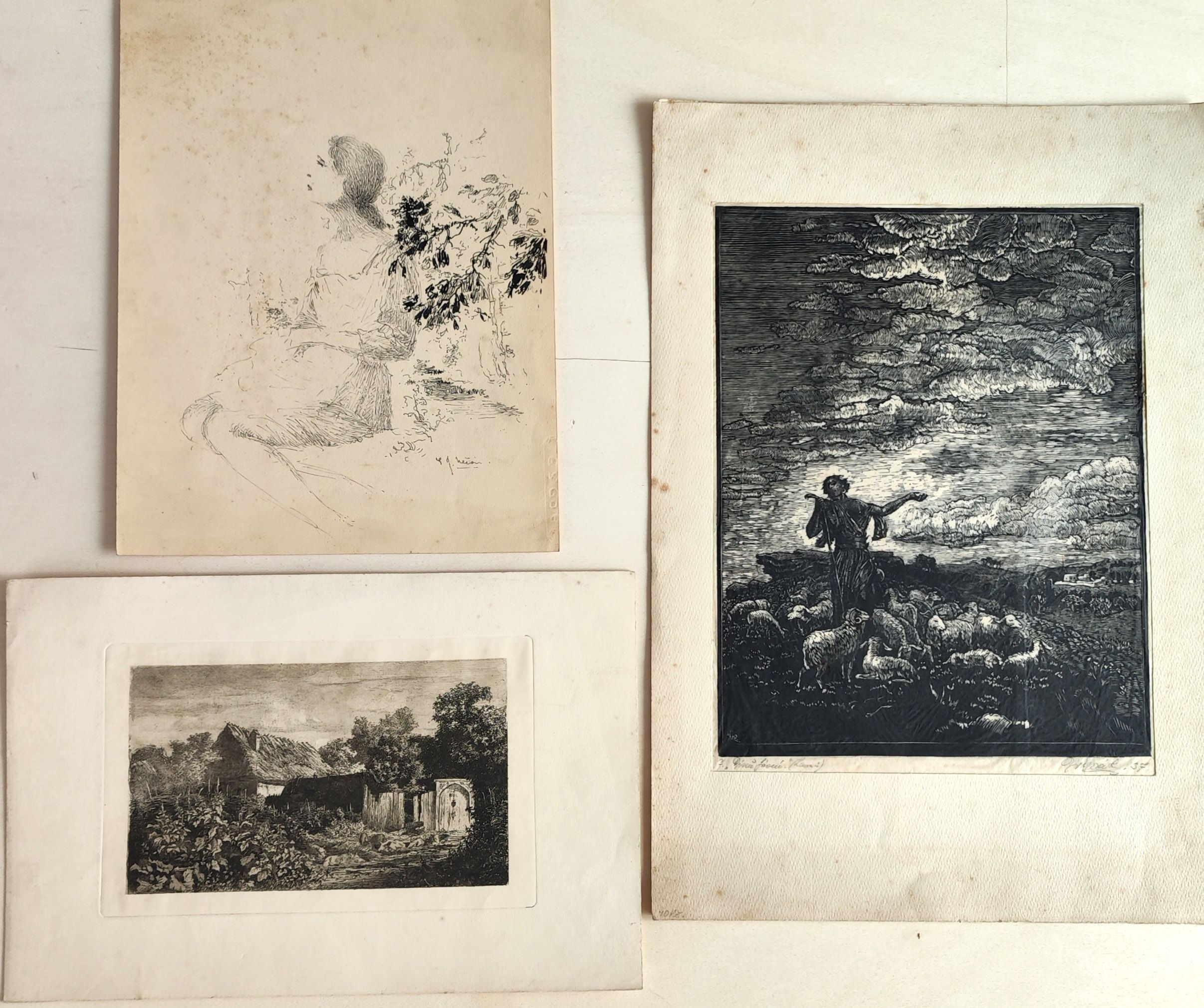 POPIS: 2x lept , 1x perokresba, rozměry: Pastýř, lept na japanu: 30 x 23 cm,, Statek: 12 x 20 cm, Dívka: 31 x 23,5 cm, volné listy