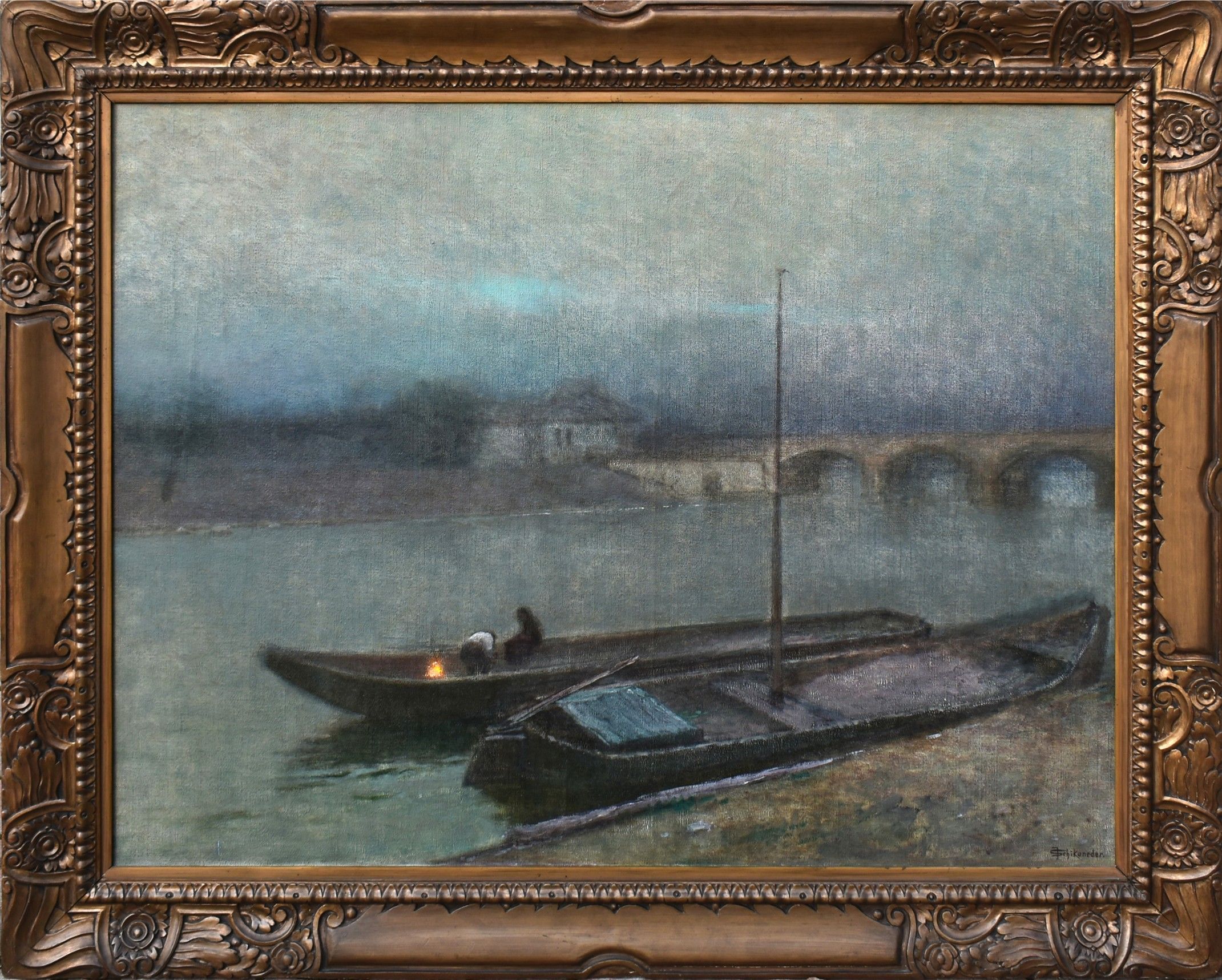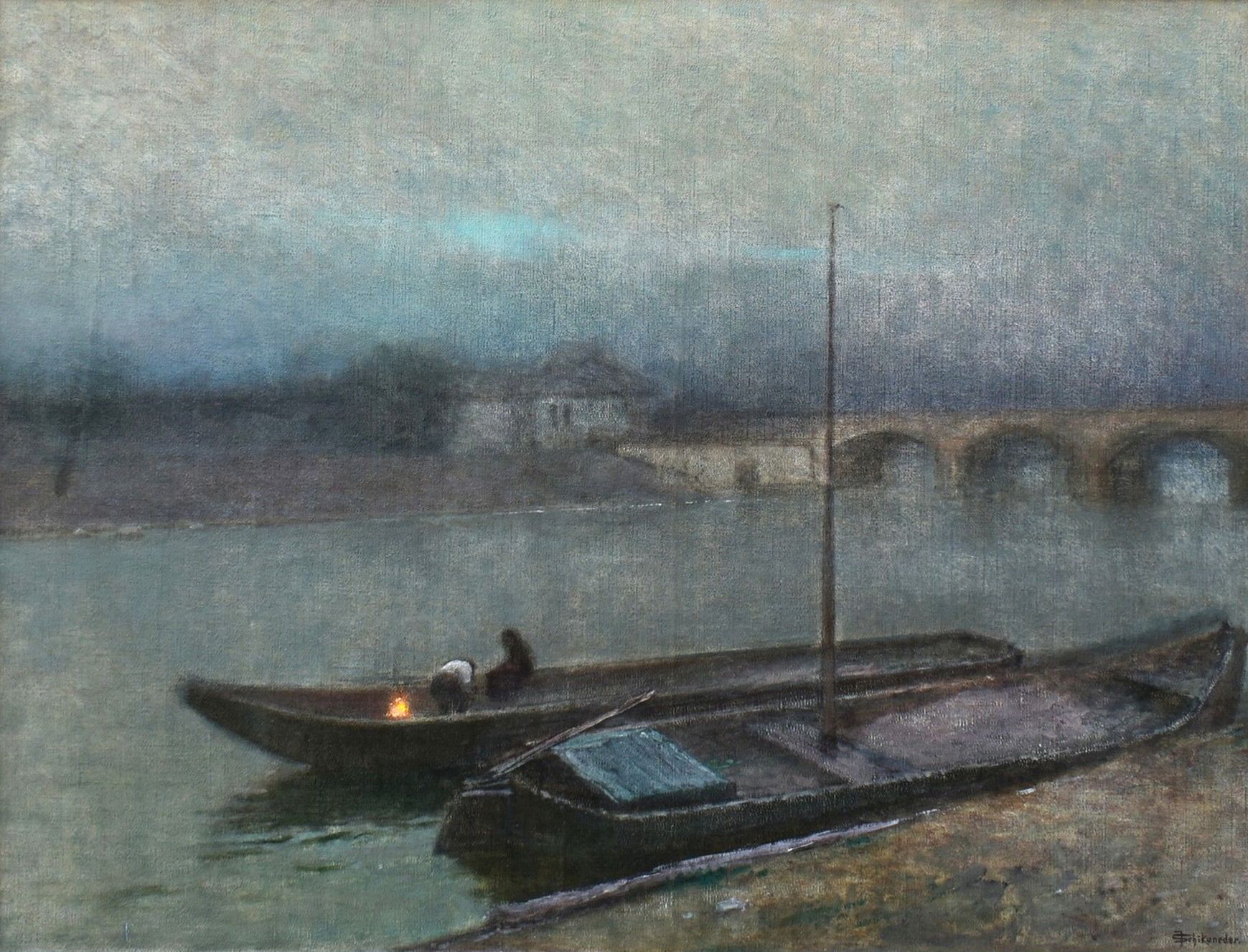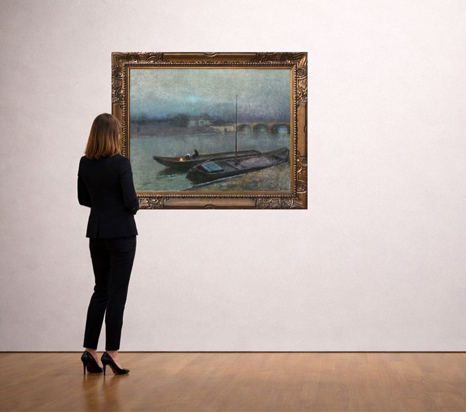 Malba představuje tiché vltavské nábřeží zahalené soumrakem, s loděmi klidně spočívajícími u břehu.