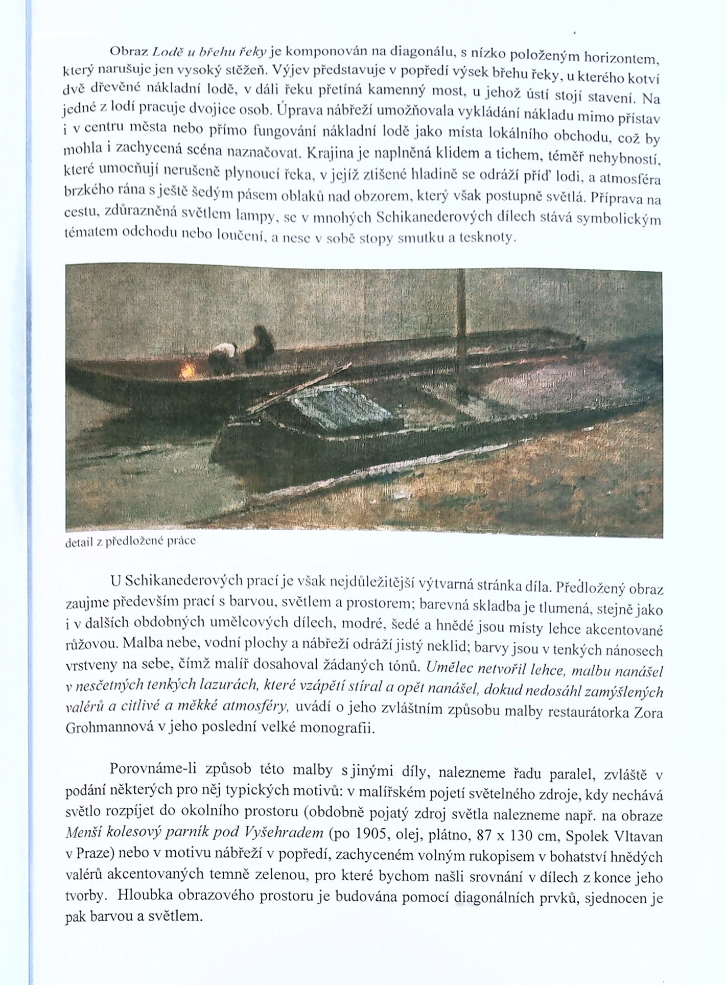 Tlumená barevná škála, jemné přechody světla a mlhavá atmosféra patří k vrcholným znakům autorovy pozdní tvorby. Schikaneder zde mistrně pracuje s náladou a tichem, v nichž se prolíná pocit melancholie a samoty.