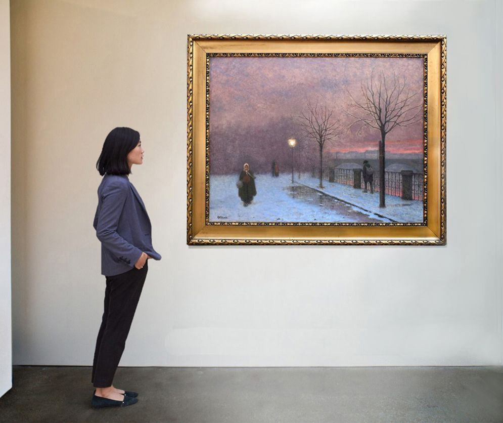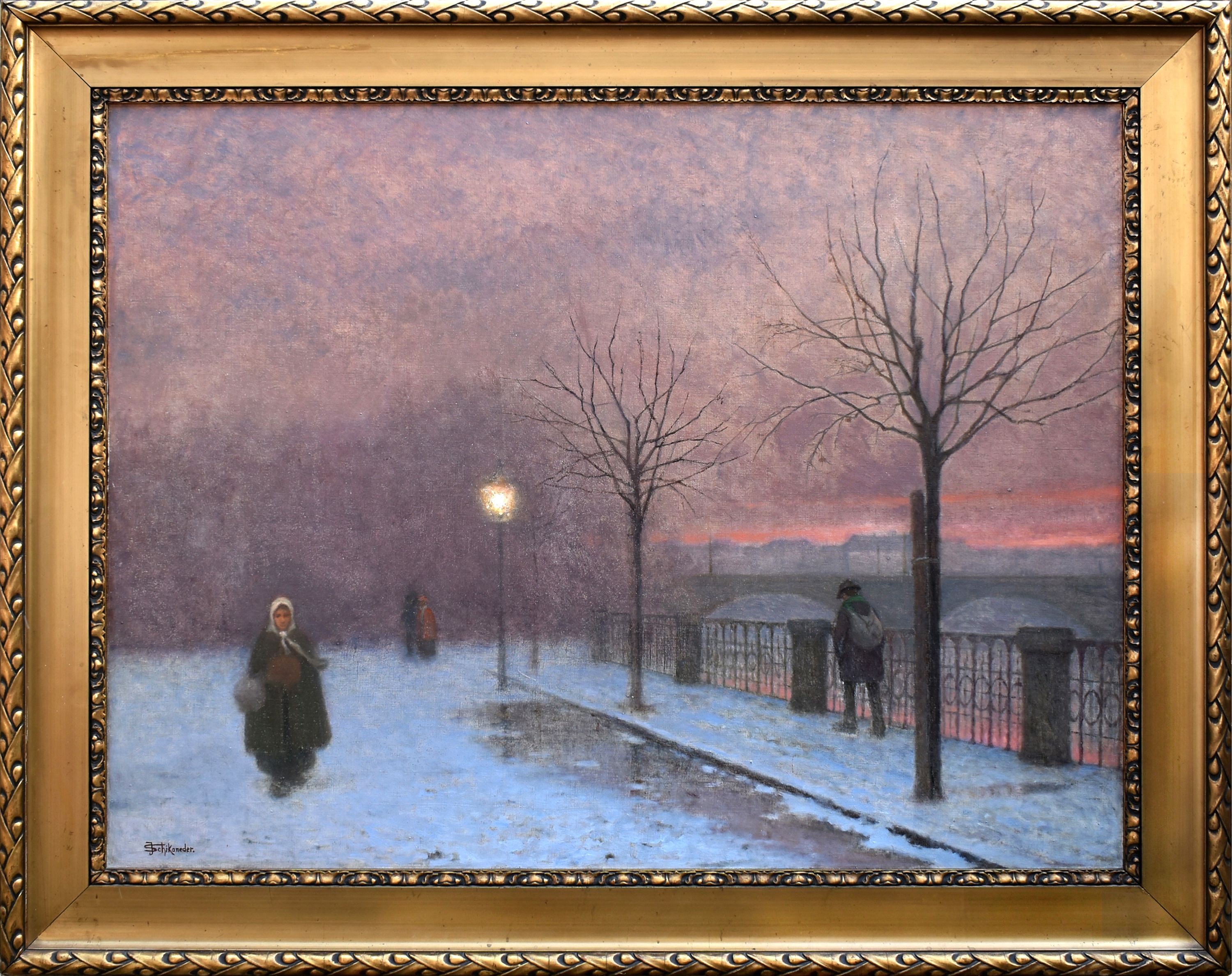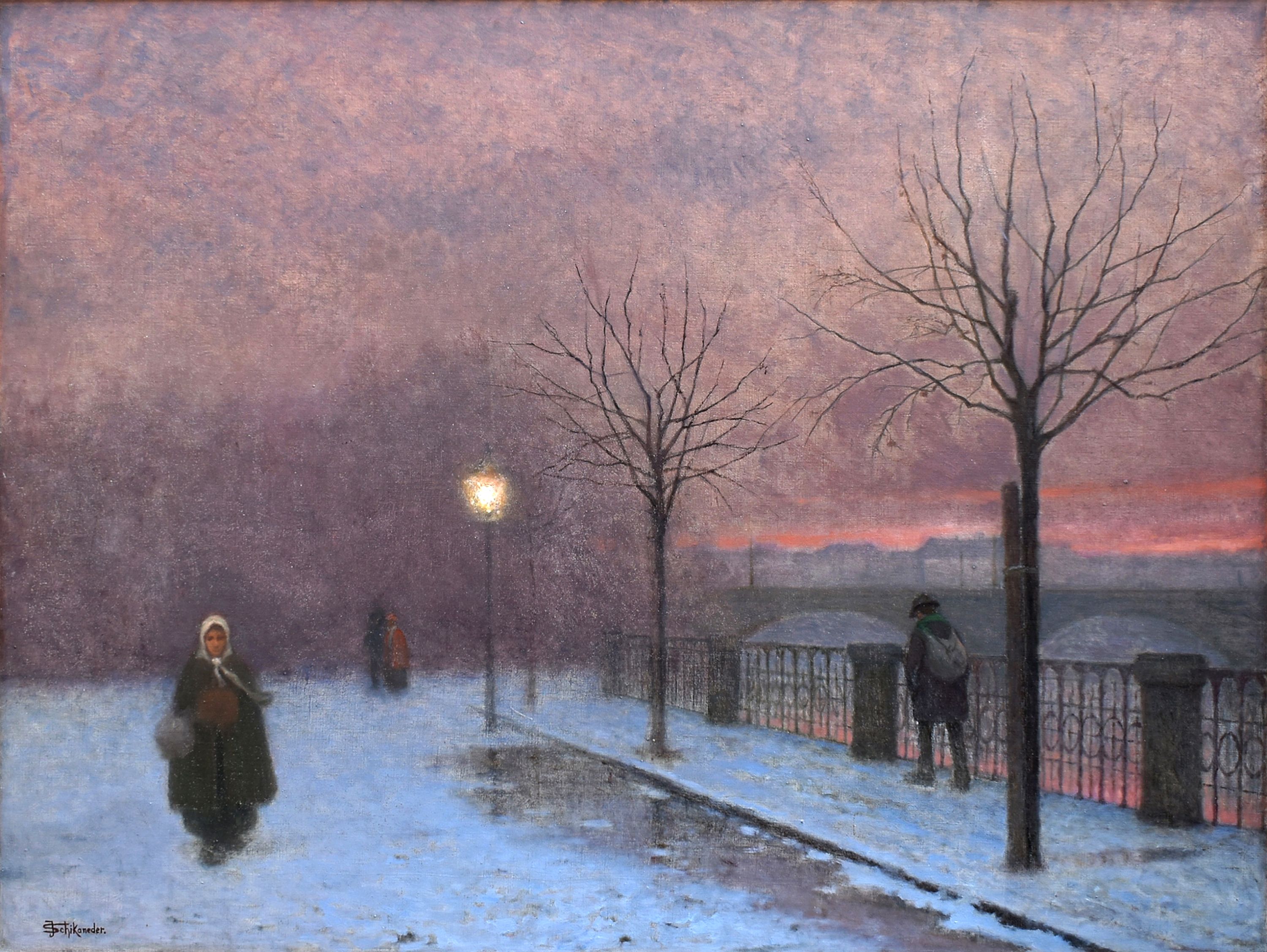 Obraz zachycuje tiché pražské nábřeží v zimním soumraku, kdy se město noří do mlhy a tlumeného světla lampy. Osamělé postavy kráčející podél řeky a siluety holých stromů umocňují pocit klidu, melancholie a rozjímání, který je pro Schikanederovu pozdní tvorbu příznačný. Jemná barevná škála fialových, šedých a růžových tónů spolu s citlivou prací se světlem vytváří atmosférickou scénu, v níž realita vystupuje náladovému a symbolickému vyznění.