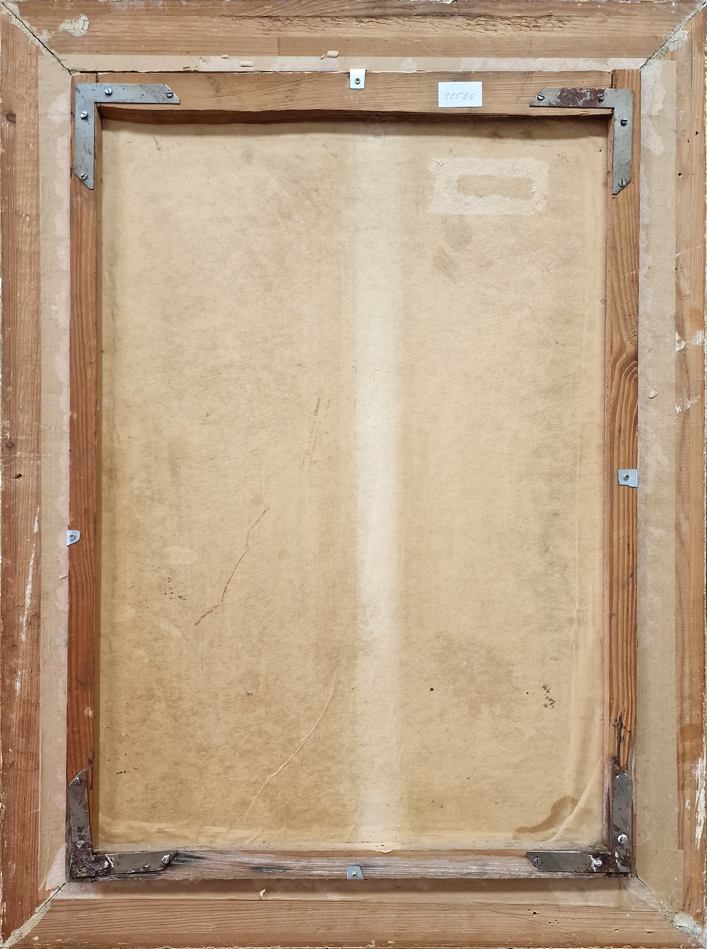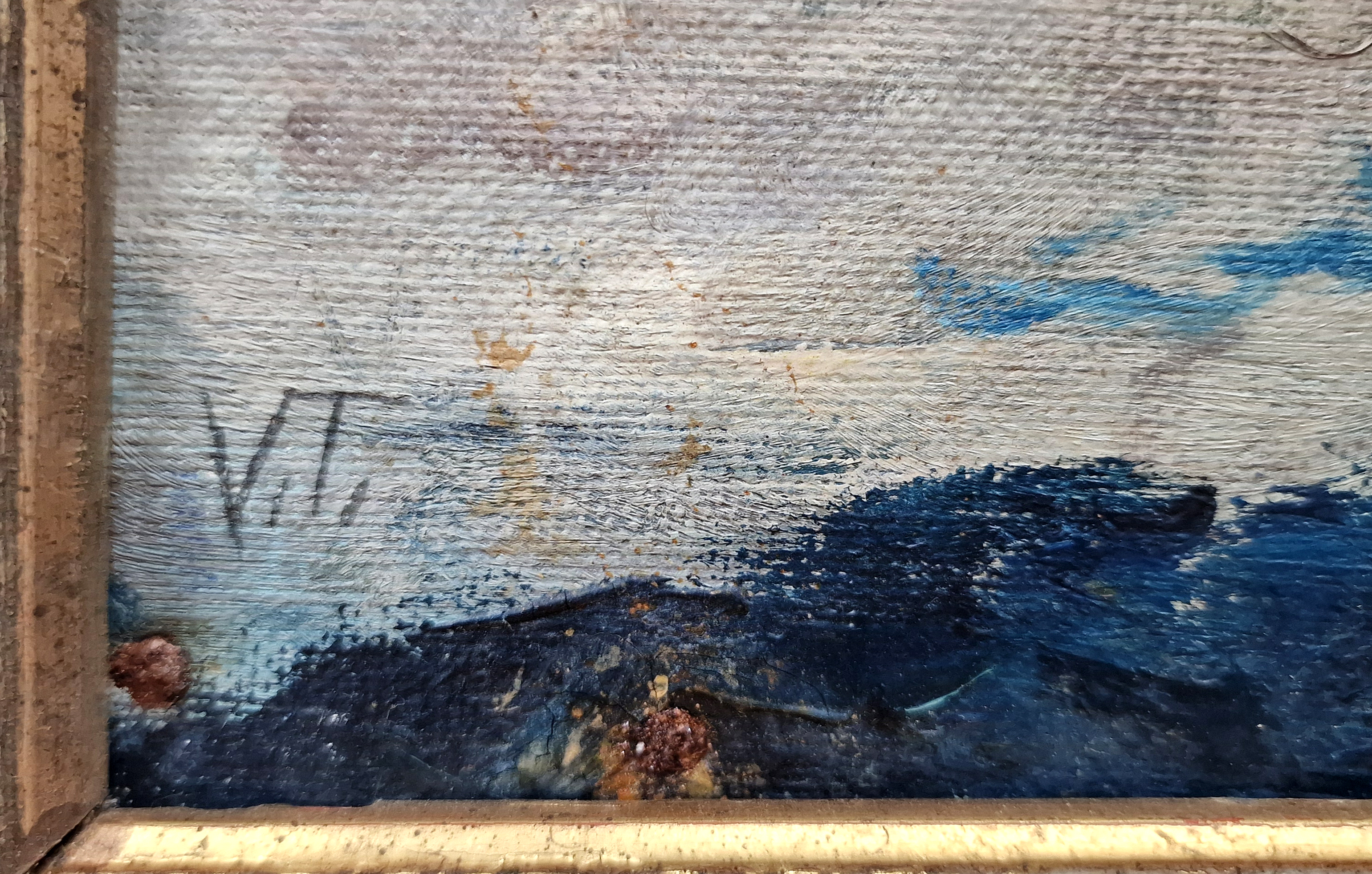 POPIS: Olej na plátně fixováno na lepence, rozměr 70 x 50 cm. Po okrajích jsou patrné hřebíčky. Signováno monogramem VT
