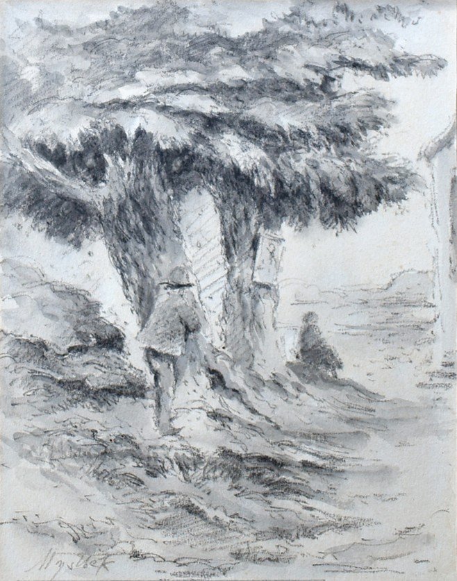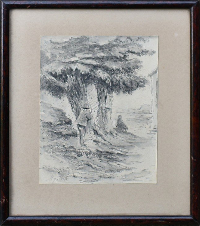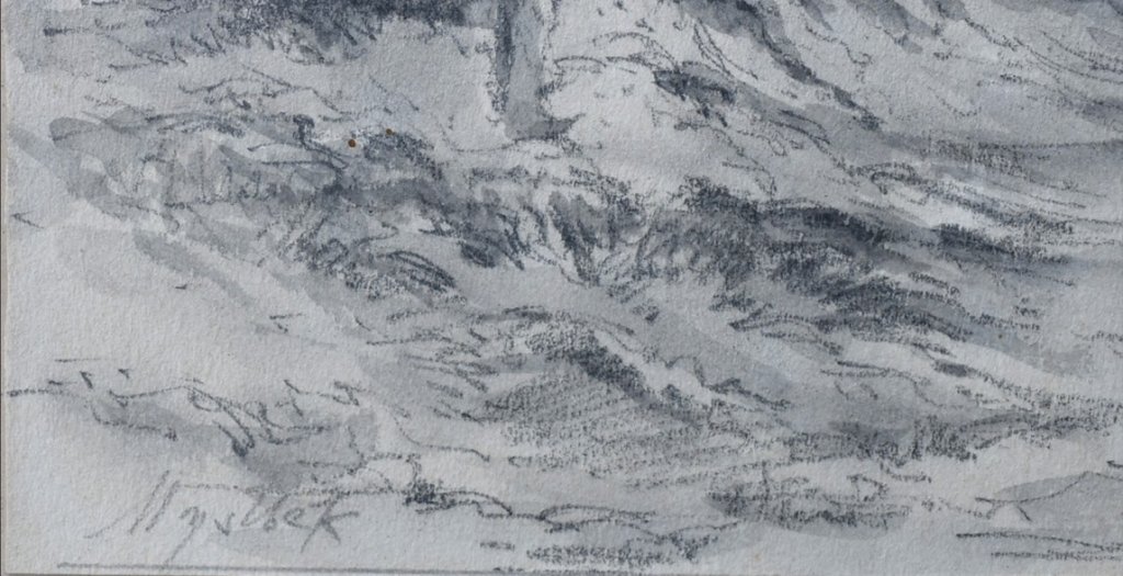 POPIS: Lavírovaná kresba, rozměry ve výřezu pasparty: 16 x 12,5 cm, zaskleno