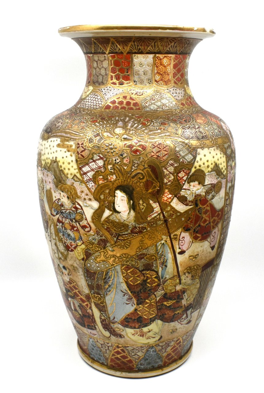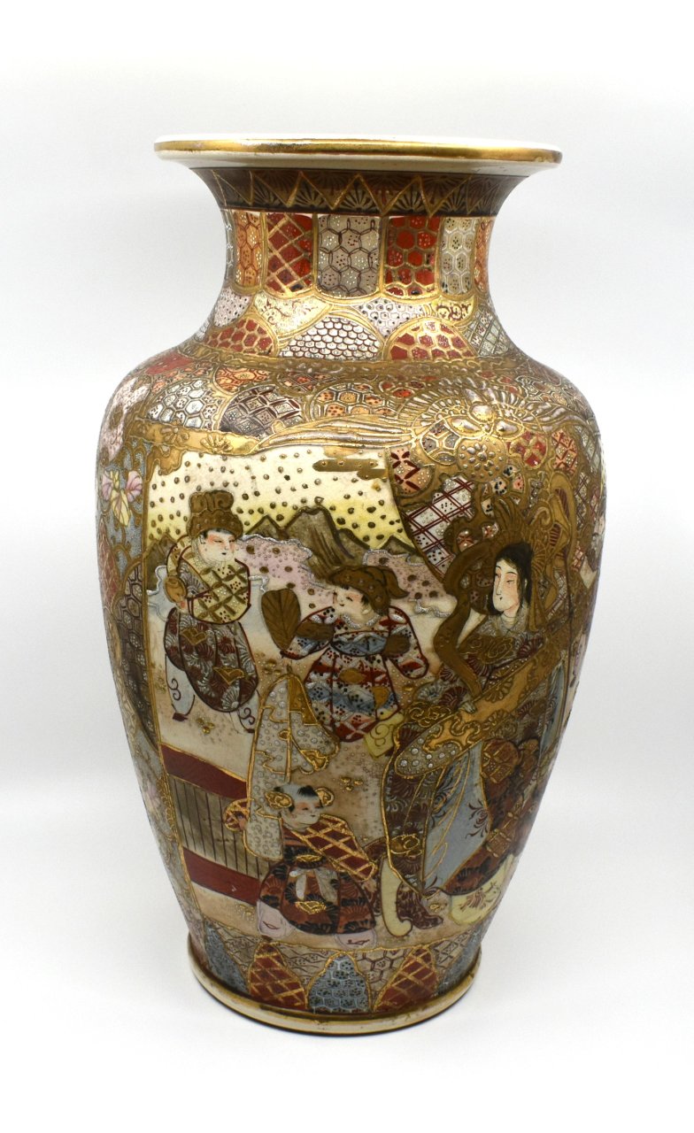 POPIS: Japonský porcelán, váza Satsuma - Ostrov Kjúšú. Váza, malovaná, zlacená a bohatě zdobená rozličnými motivy porcelánová Výška 44 cm 19.stol