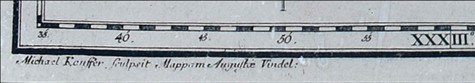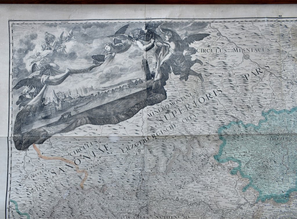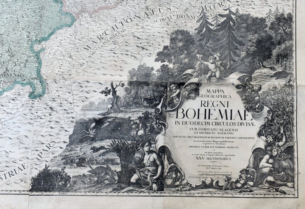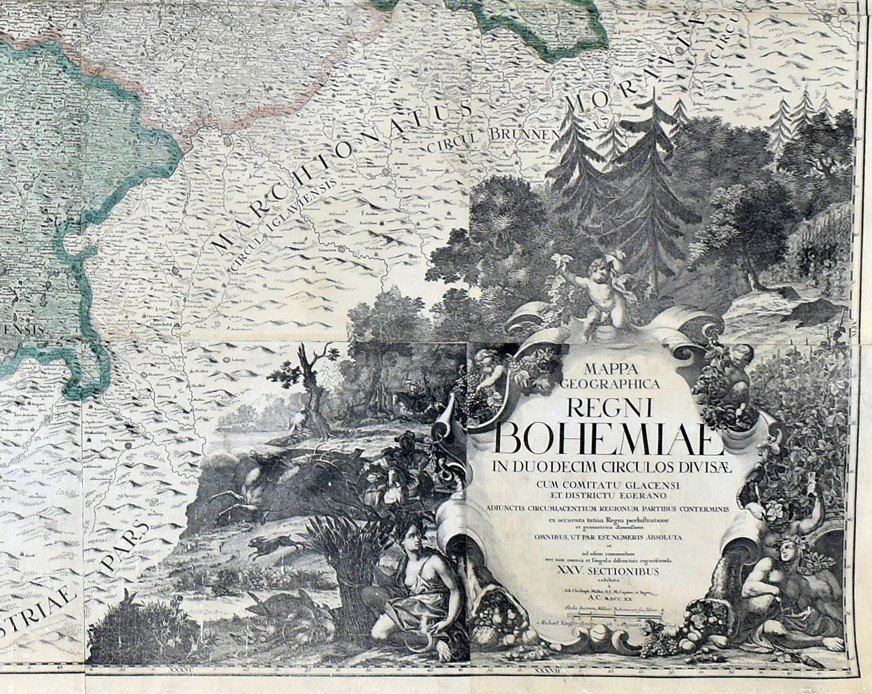 POPIS: Mědirytina papír, fixováno na plátně, rozměry: 160 x 190 cm. Mapa geographica regni Bohemiae. Staře kolorovaná zmenšená kopie Müllerovy mapy Čech, M. Kauffer, Augsburg, podle kresby V. V. Reinera. Jedná se o 25 sekcí sesazených v 19. století, montovaných na plátno a připevněných mezi 2 lišty se soustruženými hlavicemi. V levém horním rohu pohled na Pražský hrad s Karlovým mostem, vpravo nahoře český lev obklopený alegoriemi hlavních řek, vlevo dole legenda ("Characterum explicatio - Erklärung der Zeichen"). Vpravo dole velký ozdobný titul s rohy hojnosti a motivy mj. vinařství a chmelařství.