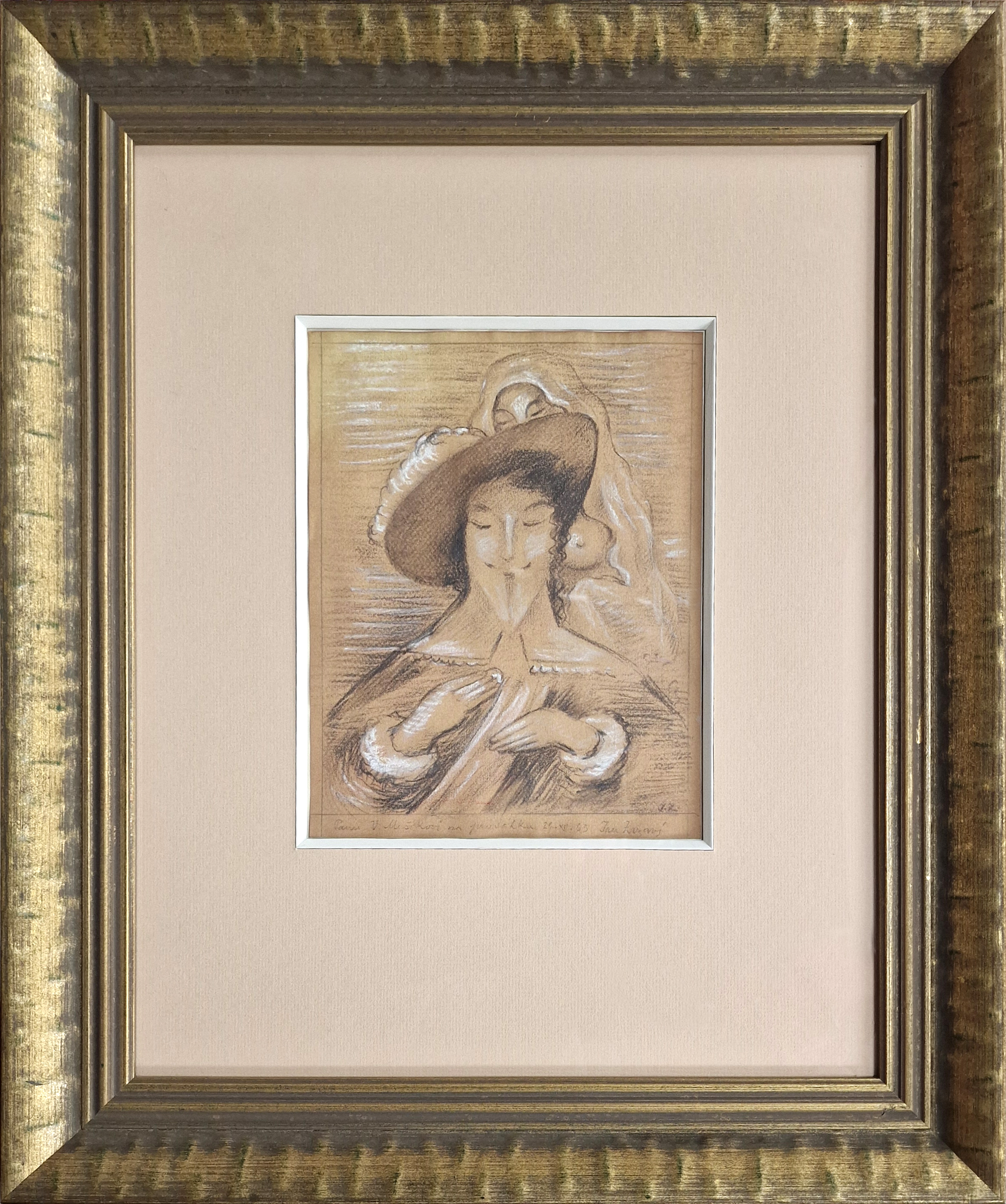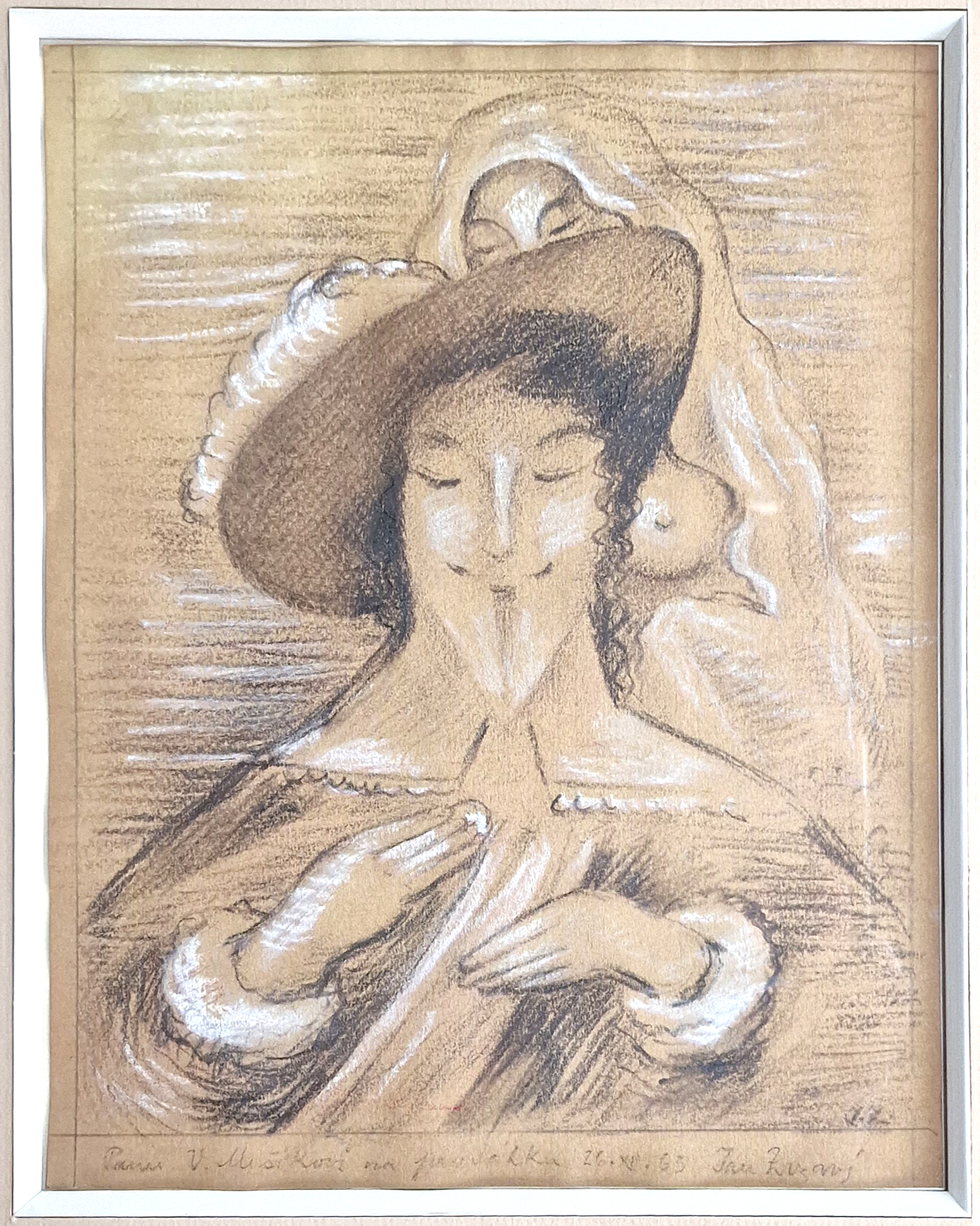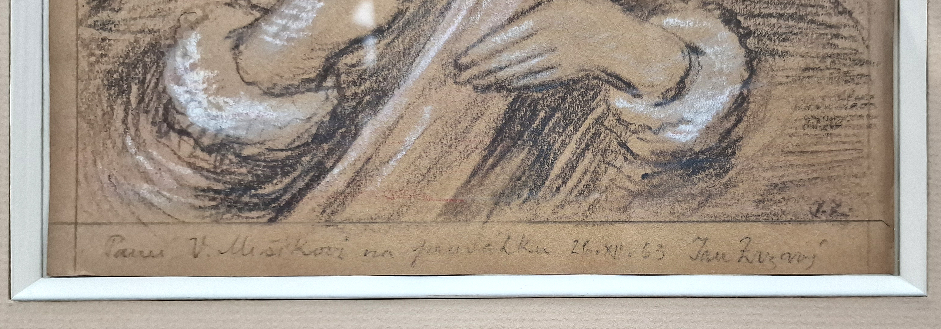 POPIS: Černá a bílá křída na papíře, rozměr 26,7 x 20,8 cm, zaskleno. K dílu vložen písemný posudek PhDr. Jany Orlíkové z roku 2013